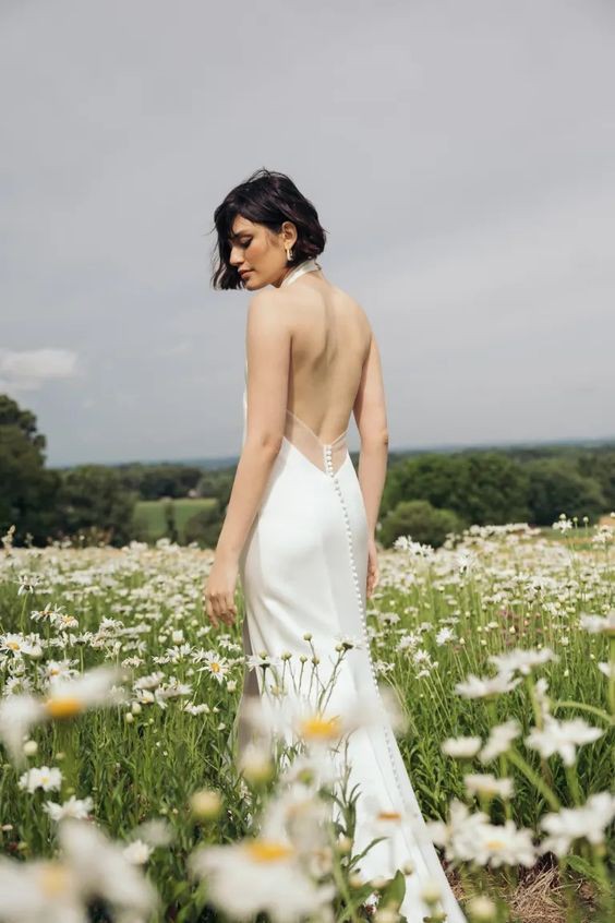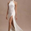 Sophisticated and alluring at once, the Jenny Yoo Harlyn Wedding Gown boasts a sleek high halter neck, intricate button detailing down the back, and a show-stopping front slit. Crafted of a soft satin, this polished silhouette makes a perfect wedding day look.