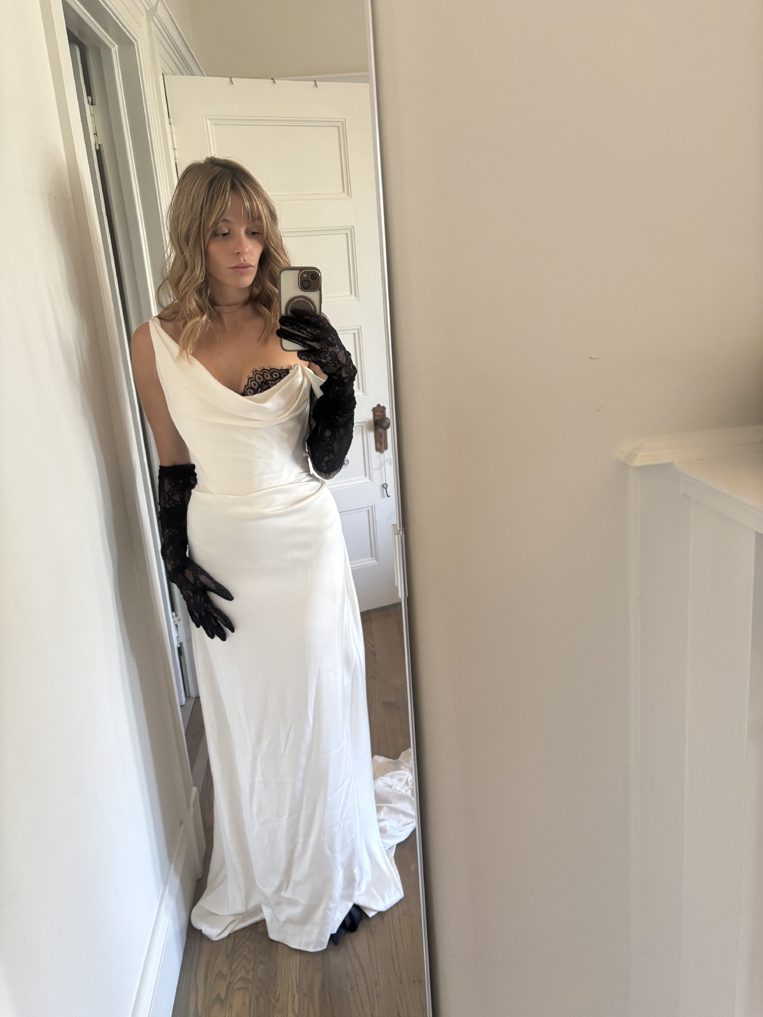I wore it with black lace gloves and neckline detail - both are removable.