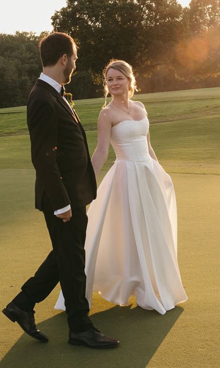 Valentina by Flora! Gorgeous, timeless look with a flattering drop/basque waist, buttons down the back, and a sweetheart neckline. Size 6 altered down to a 4 with a height of 5'2".
