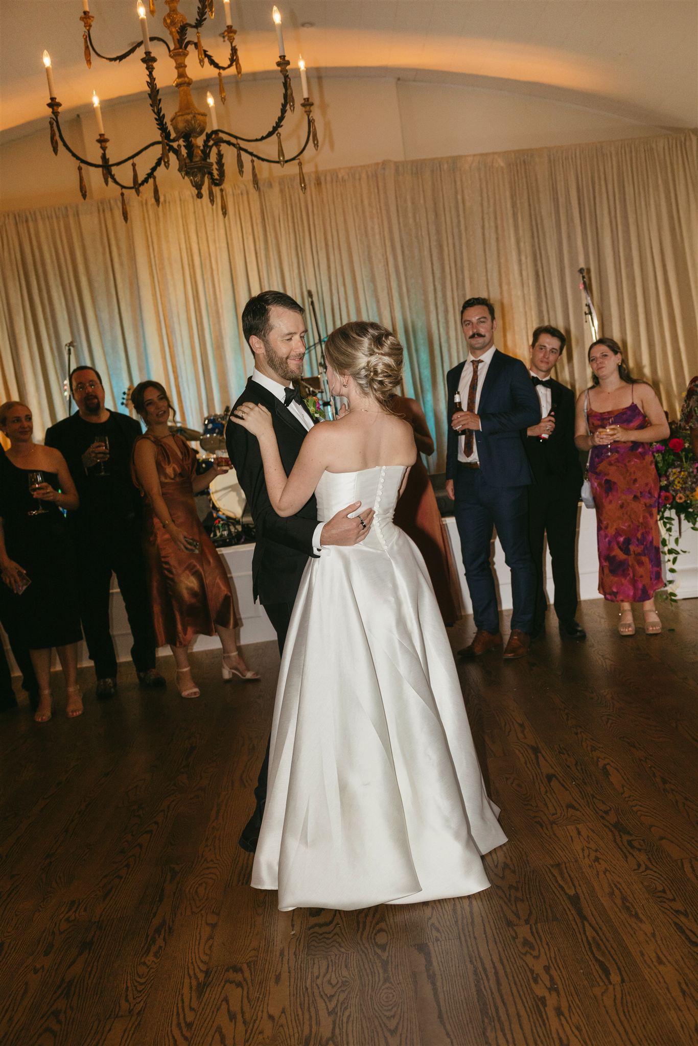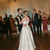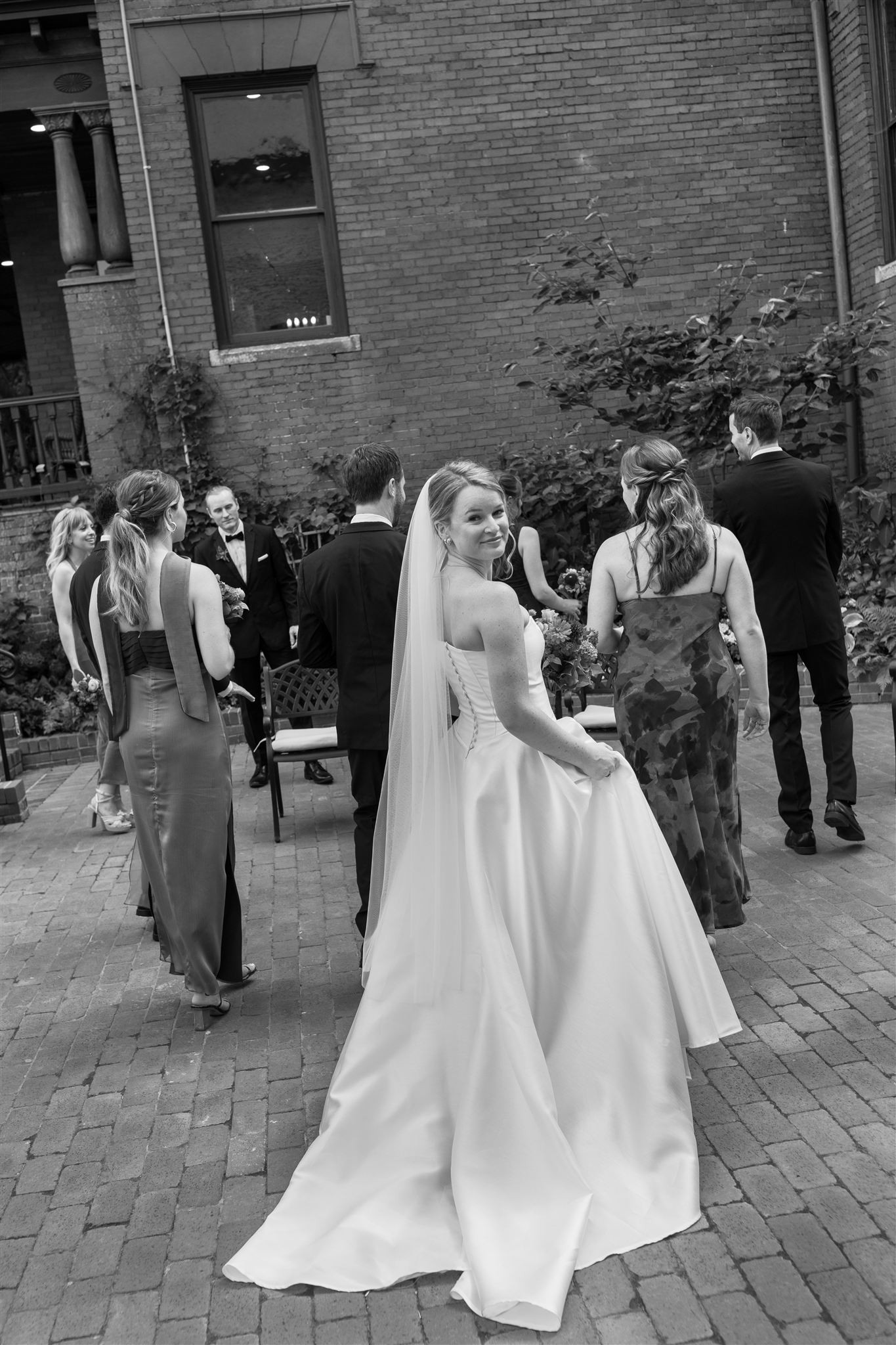 Bustled with an English bustle - you can see the train in one of my photos, and then the bustled look in another. The bustle tucks the excess fabric under the dress, giving it the illusion of being floor-length. It was so easy to do, and very easy to dance in.