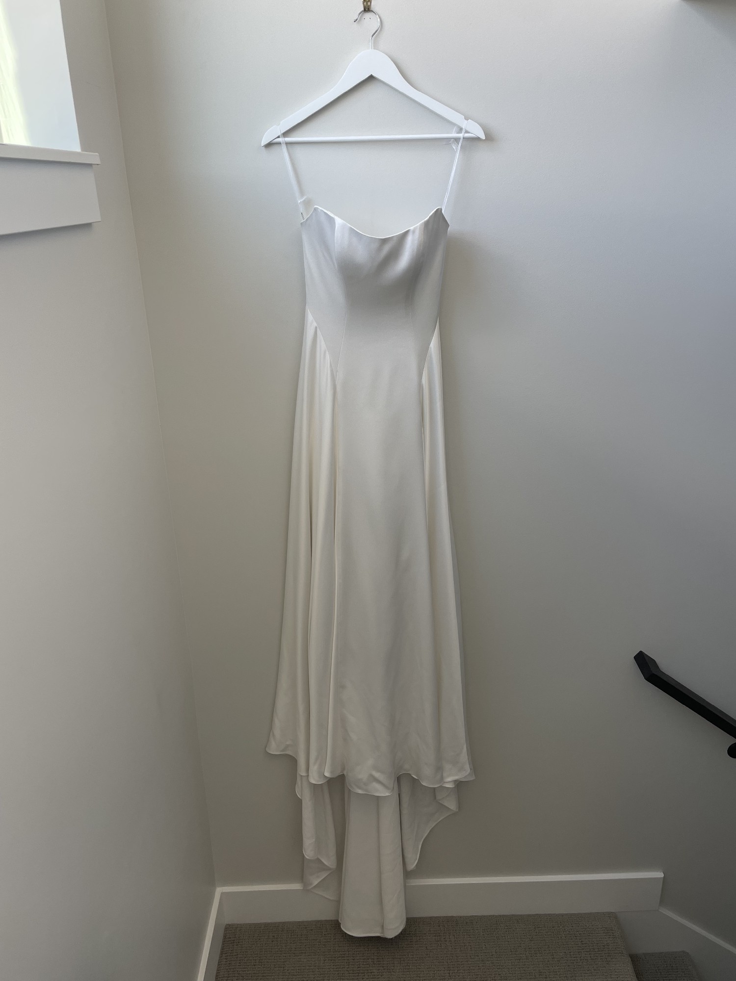 The gown is both chic and versatile—perfect for a vineyard, barn, or modern city wedding. Its clean lines make it easy to style with either understated or statement accessories.