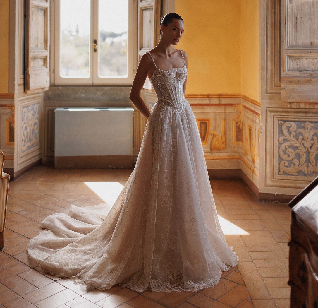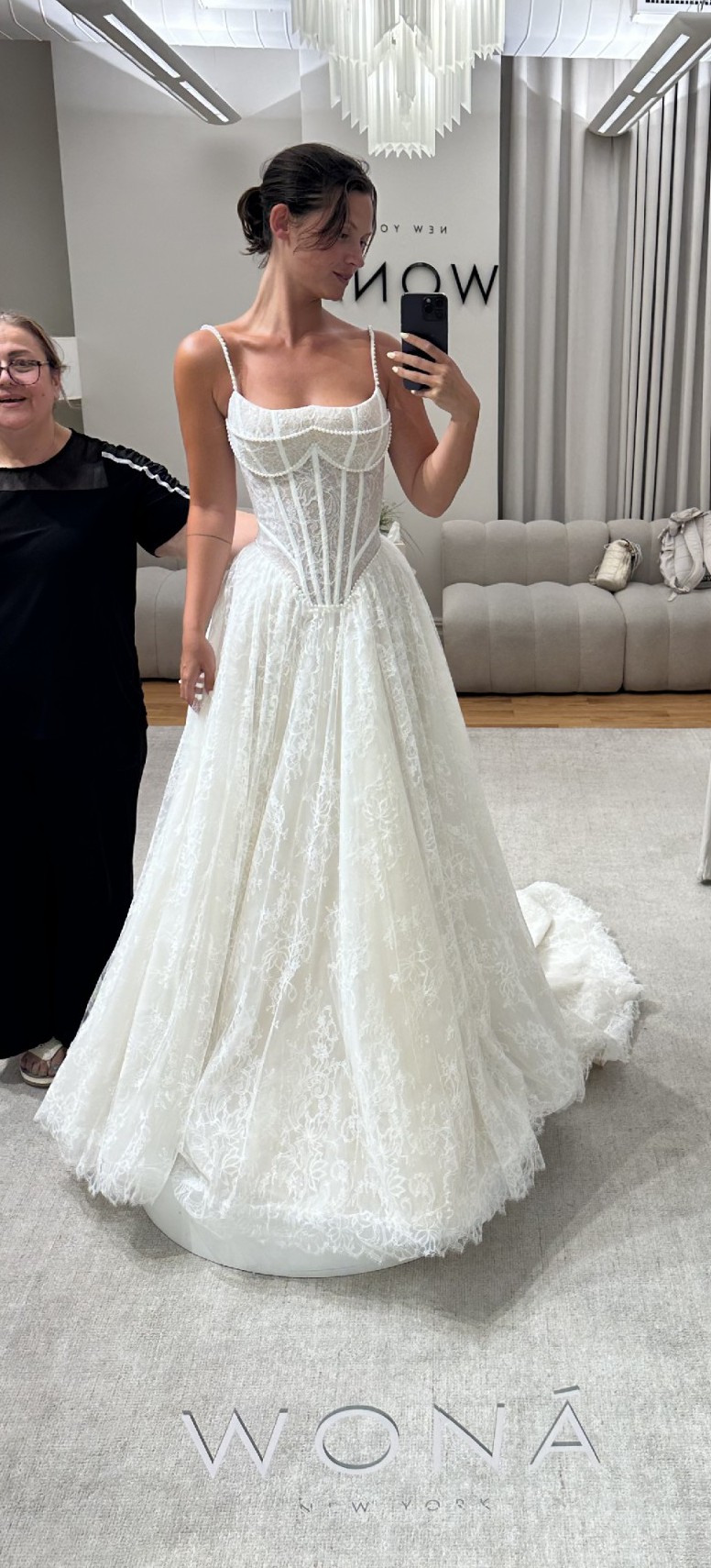 2025 release Hunter Dress purchased from Wona Concept NYC. Classic and elegant with thoughtful details. This dress features a straight neckline corset with straps, a pointed waistline, and a flowing, layered A-line skirt. Handcrafted floral embroidery and pearl-accented lace add a unique and refined touch.