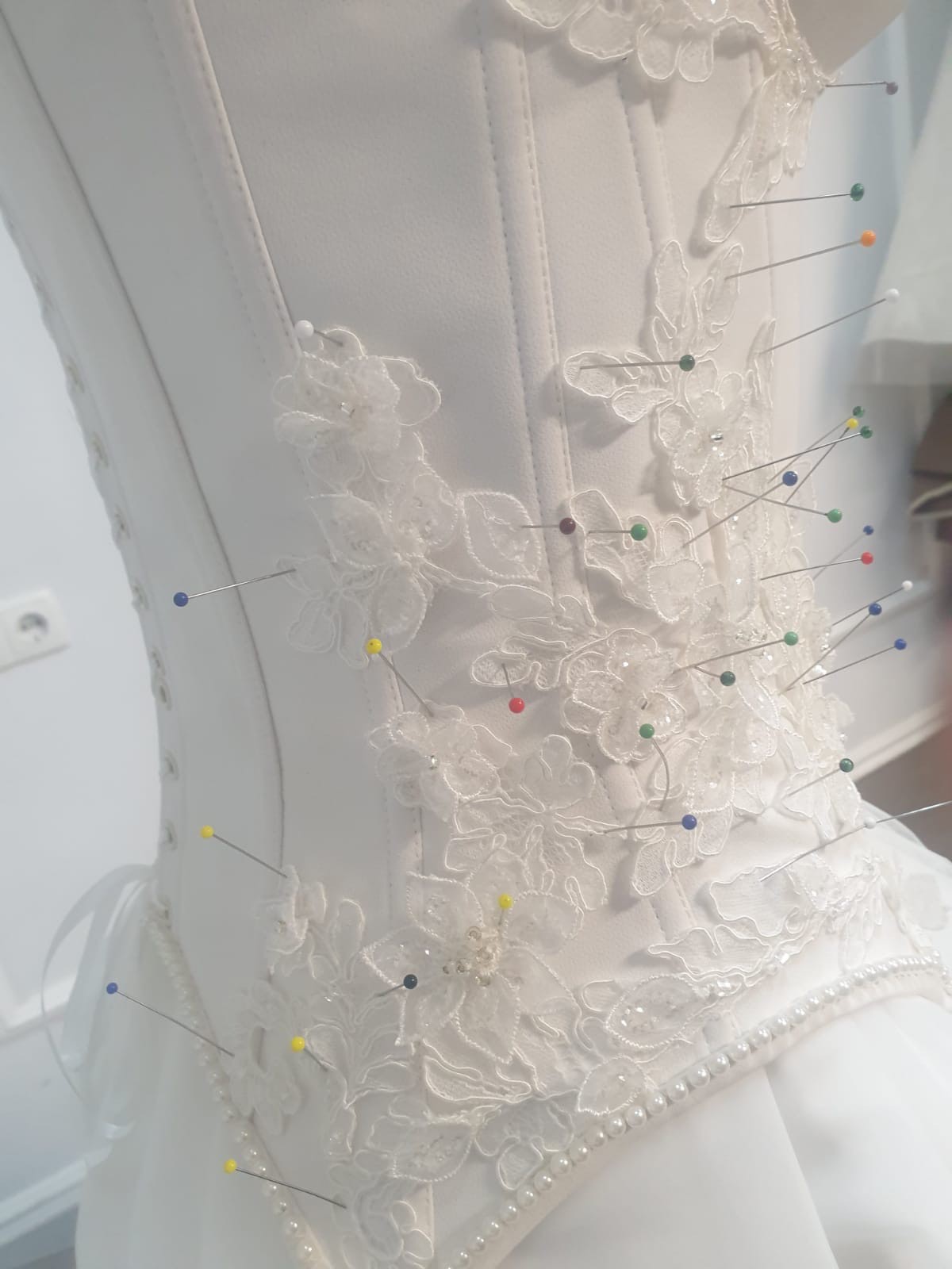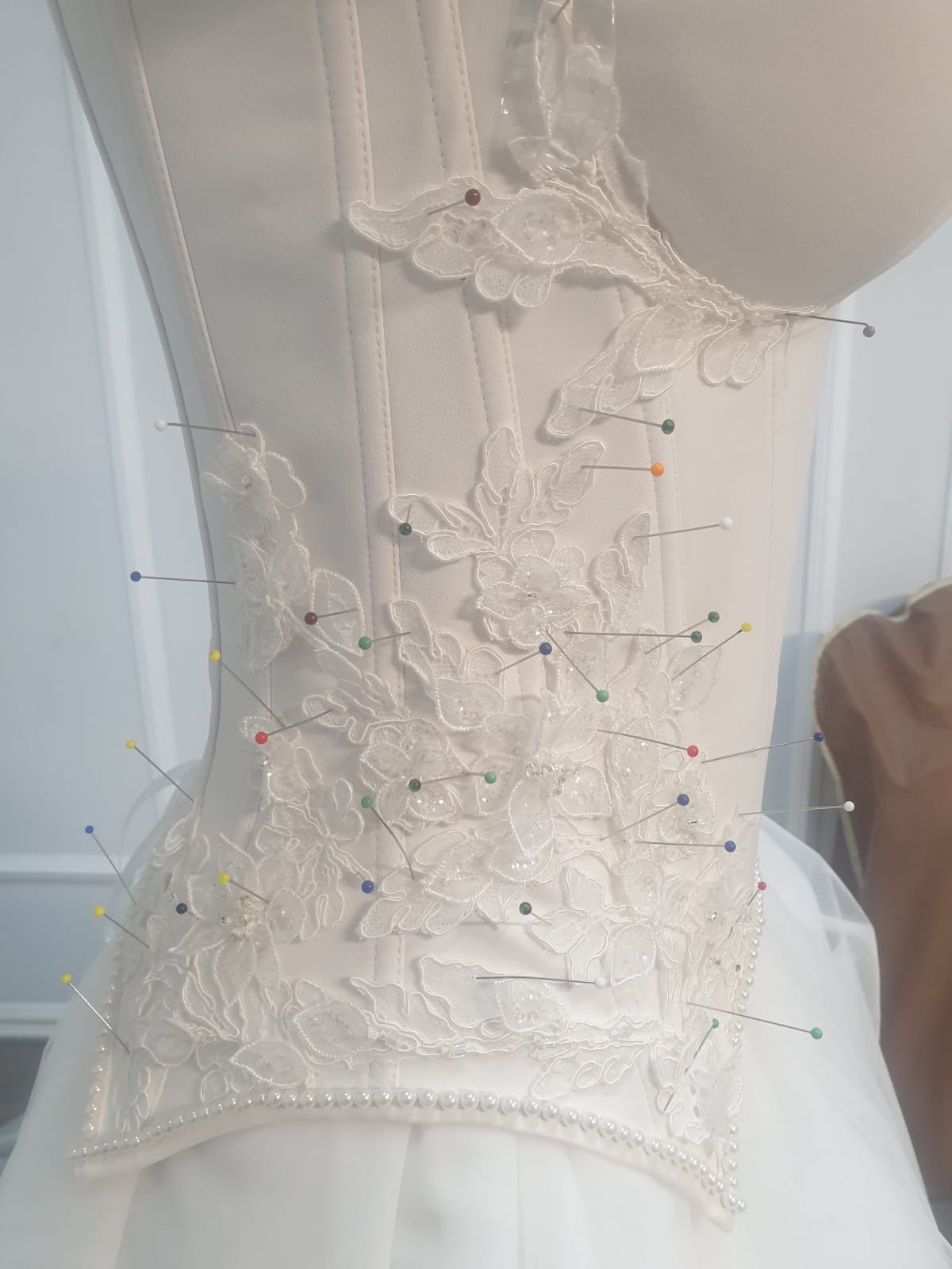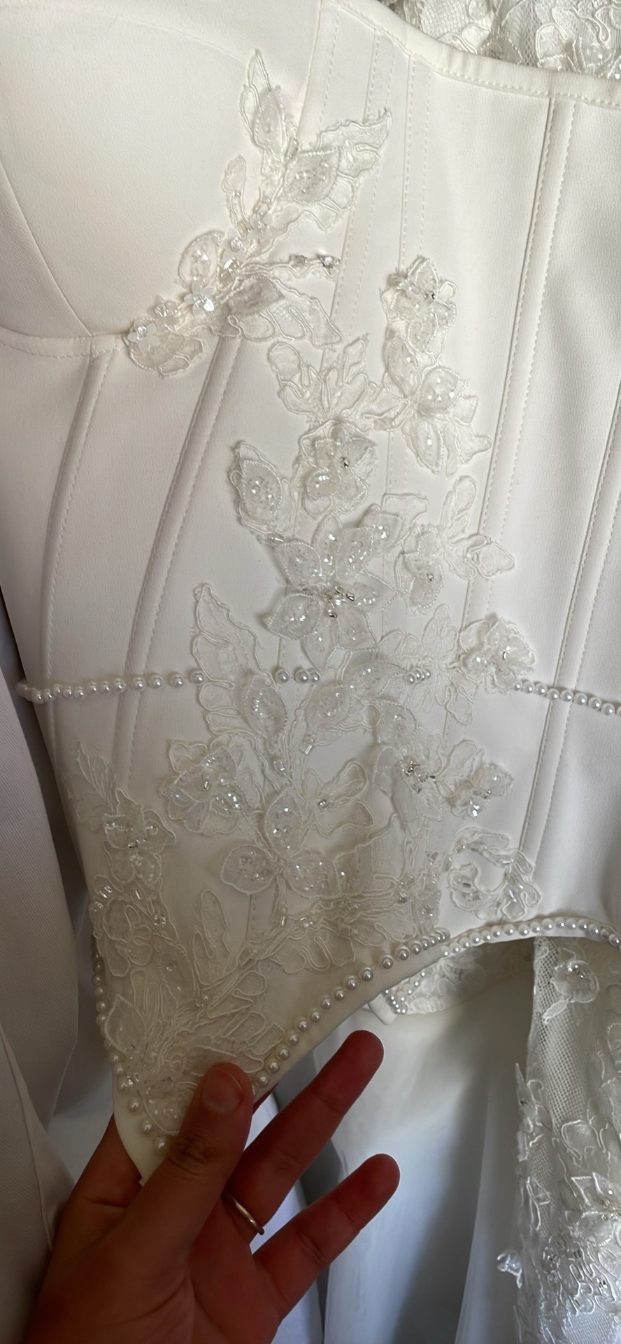 Corset Bodice (detachable): A beautifully structured corset with intricate hand-applied lace appliqué and delicate pearl detailing along the waistline. The corset is separate from the skirt, allowing for a customizable fit and styling flexibility.