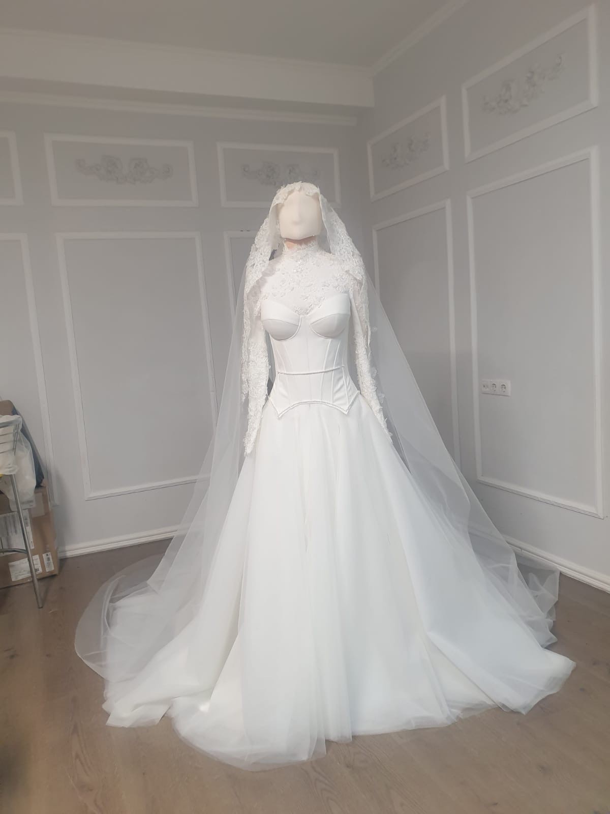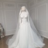 Long Cathedral Veil: A matching lace-embellished veil completes the look, adding dramatic elegance.