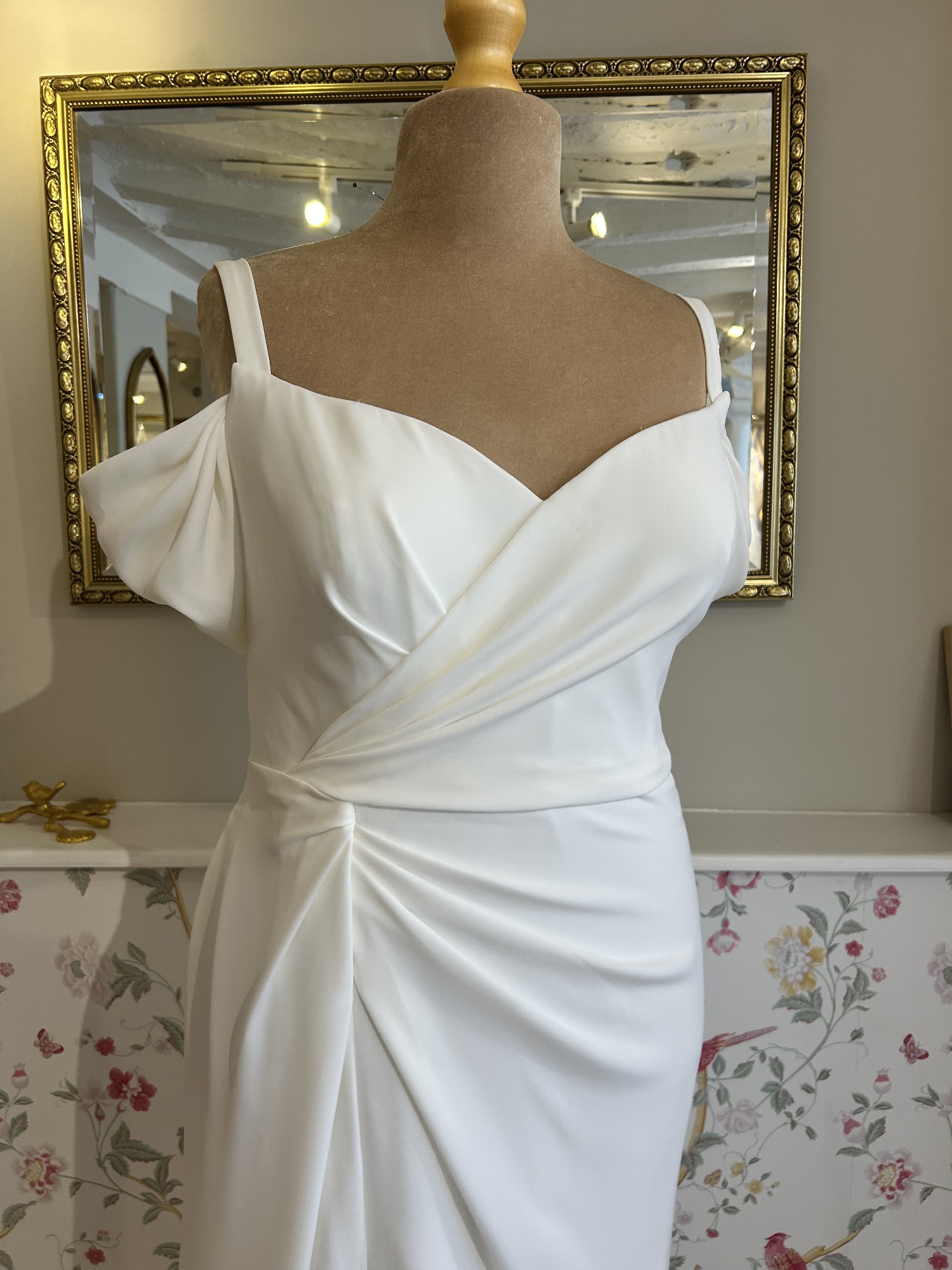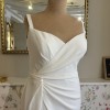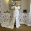 This stunning Doan gown from Modeca Curves is a perfect embodiment of elegance and modernity, designed specifically for the curvaceous bride who wants to make a memorable statement. The sheath silhouette beautifully skims your figure, accentuating your curves while ensuring ultimate comfort throughout your special day. Crafted from luxurious crepe, the fabric flows effortlessly, enhancing your movements as you glide down the aisle. The off-the-shoulder neckline offers a romantic flair, while the detachable drop sleeves provide versatility, allowing you to customize your look for both the ceremony and the reception. With a high slit that adds a touch of drama, this floor-length dress balances sophistication with a hint of daring allure, making it perfect for the bride who is confident and chic.