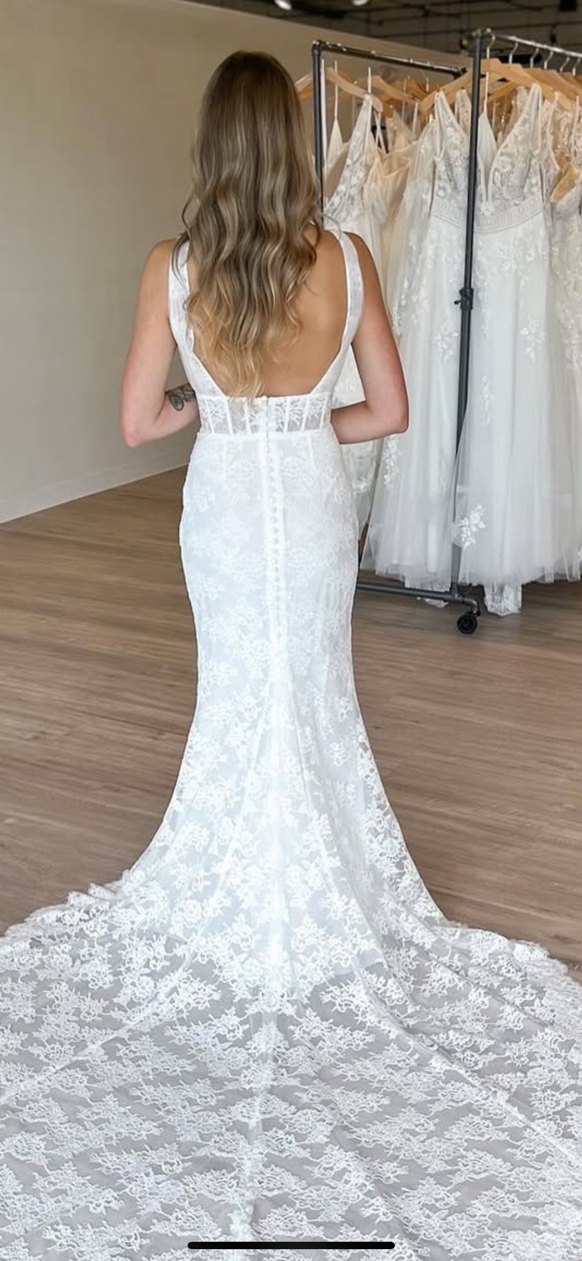 This one of the most comfortable, light & stunningly flattering wedding dresses I have ever tried on…it’s simply beautiful. The back is so gorgeous too 🤎 My plans have now changed so this is why I am now selling this brand new immaculate dress in a AU Size 8 (I’m a UK size 8 & it fits perfectly) directly purchased from the Made With Love website. Original price was £2450. Selling for £600 ONO. Any questions or if you’d like further photos then please do ask 🙏🏻 The Frances Made With Love dress comes in two variations of a wedding gown by the Australian brand Made With Love, designed by Carla Jenkins: the original Frances, a lace gown with a sheer bodice, pleated tulle, and intricate boning. Both styles are known for their elegant, modern designs that enhance the feminine figure and are part of Made With Love's popular, comfortable collection.