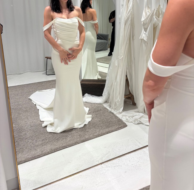 I’m selling my gorgeous Phoebe dress from Grace Loves Lace! It’s the perfect strapless crepe wedding dress—super simple, elegant, and so flattering thanks to the built-in shapewear and flexible boning (no need for extra undergarments). It creates a beautiful, timeless silhouette without any fuss.