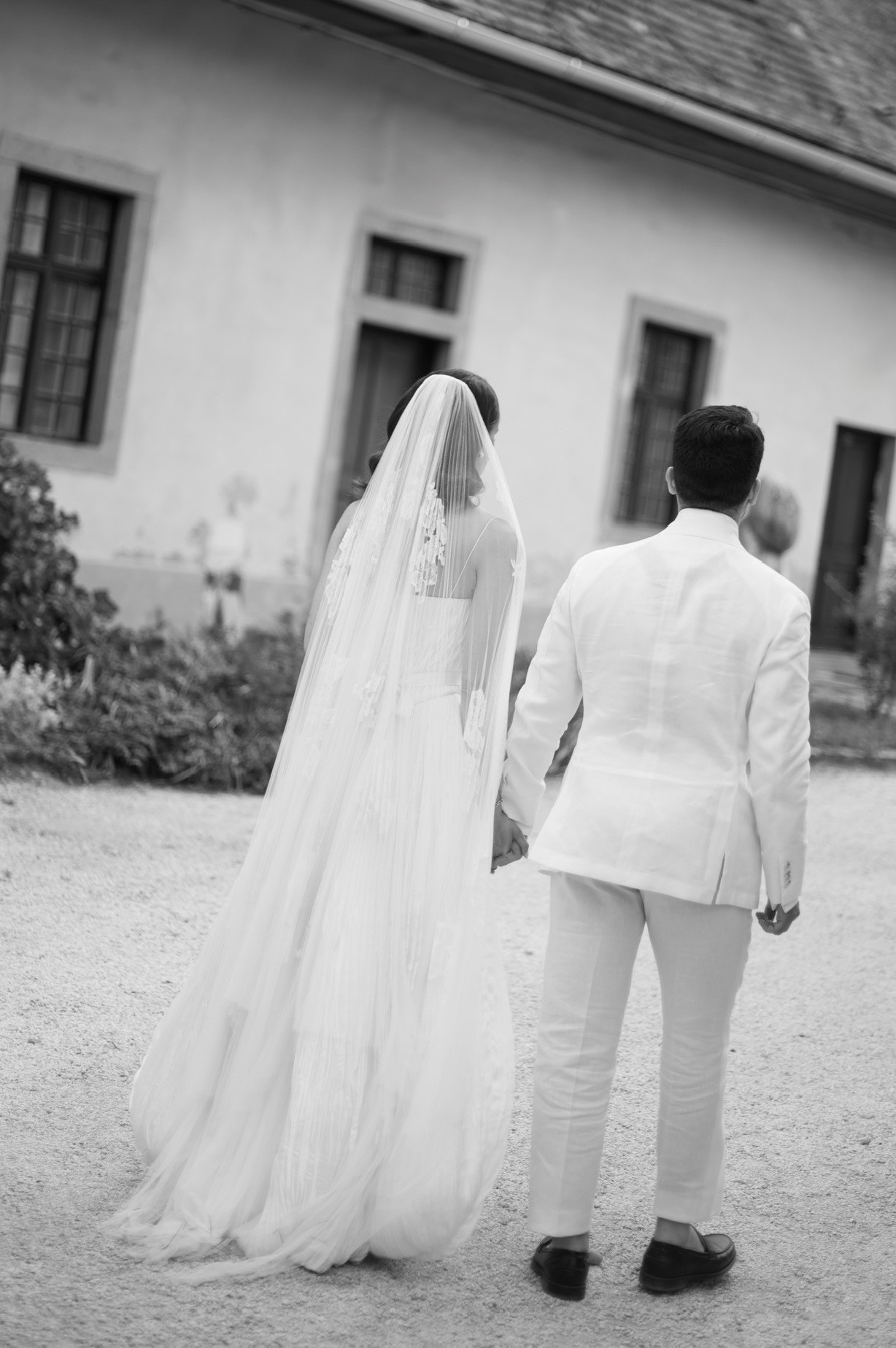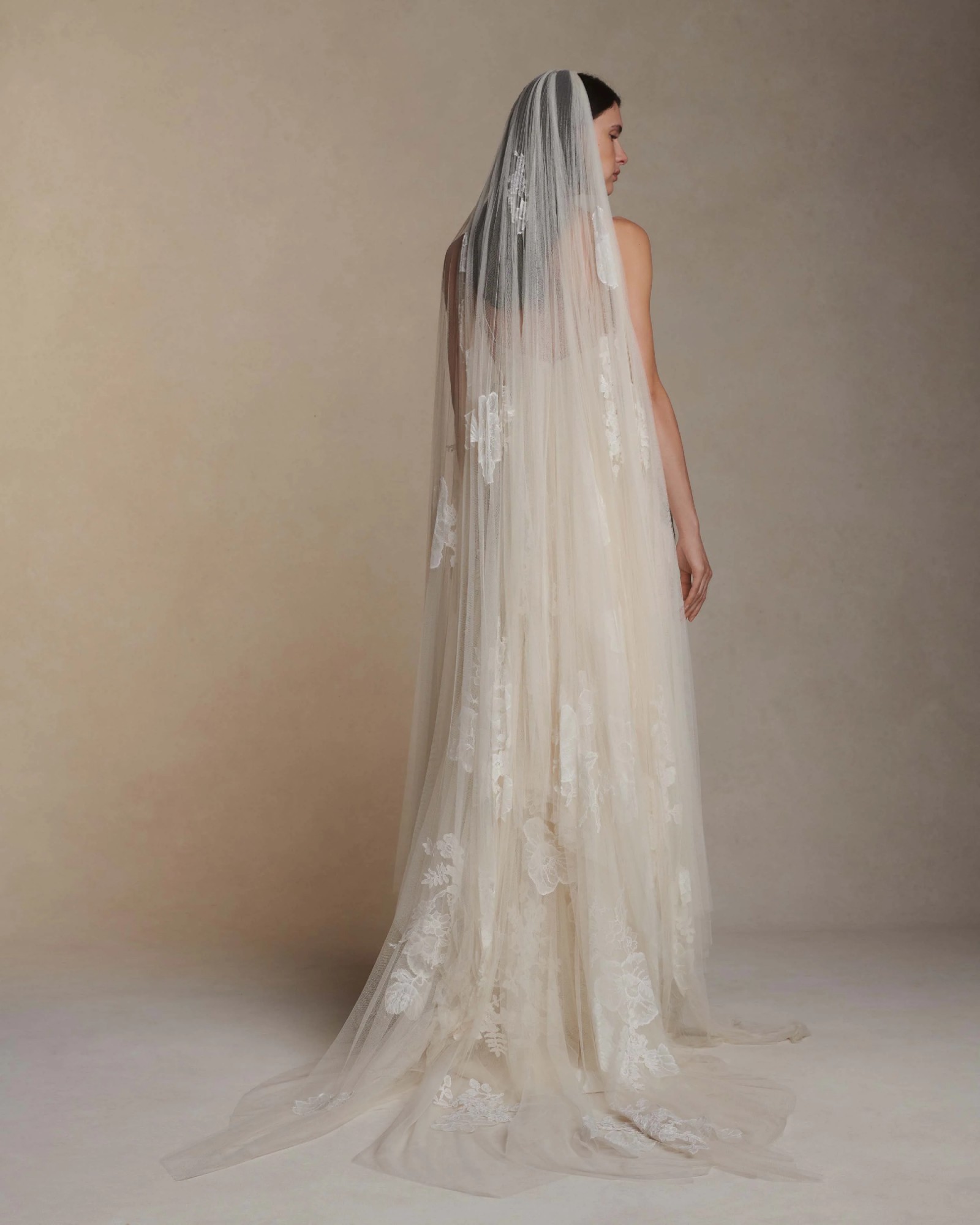 Pleated soft tulle veil decorated with hand cut Chantilly and corded lace appliqués throughout. Undulating hem measures 85” at longest point.