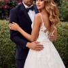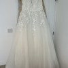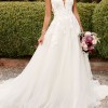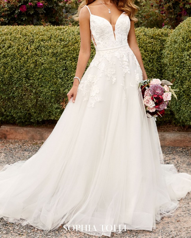 For the classic and youthful bride, let your heart be captured by this lightweight tulle romantic wedding dress. Delicate floral lace adorns the ultra-comfortable crepe bodice with plunging V-neckline and sheer tulle side panels. The detachable crepe belt highlights the natural waist, while lace appliqués trickle softly onto the A-line skirt. Beaded spaghetti straps add a subtle touch of sparkle, leading to a striking illusion lace back feature finished with fabric covered buttons.