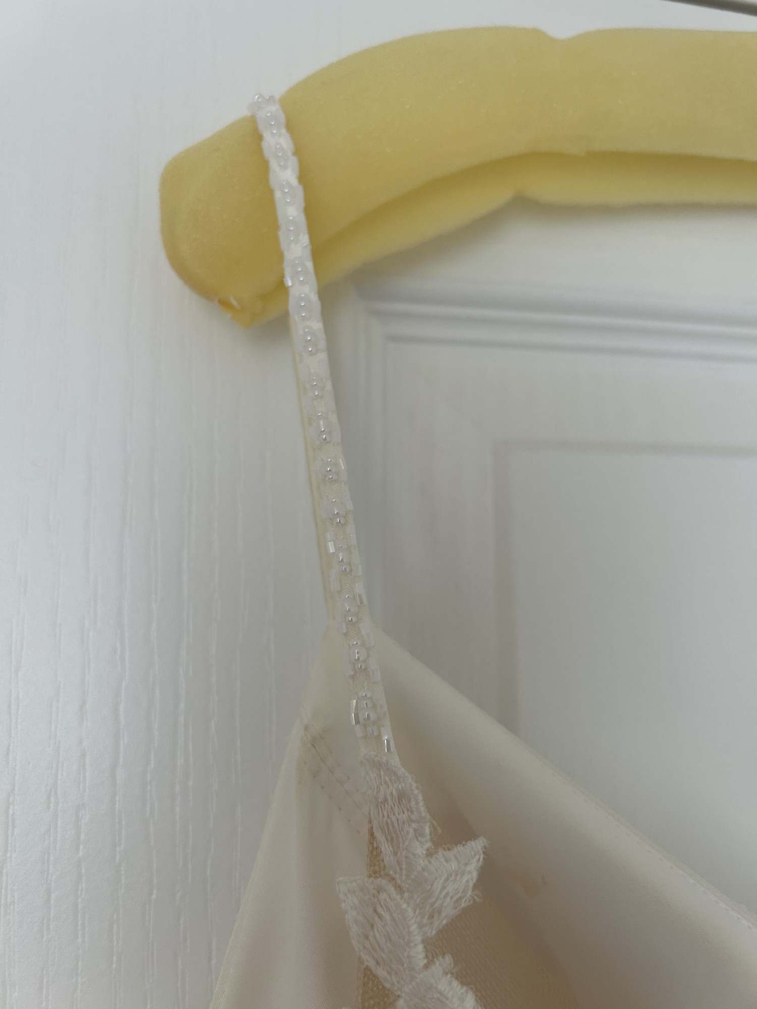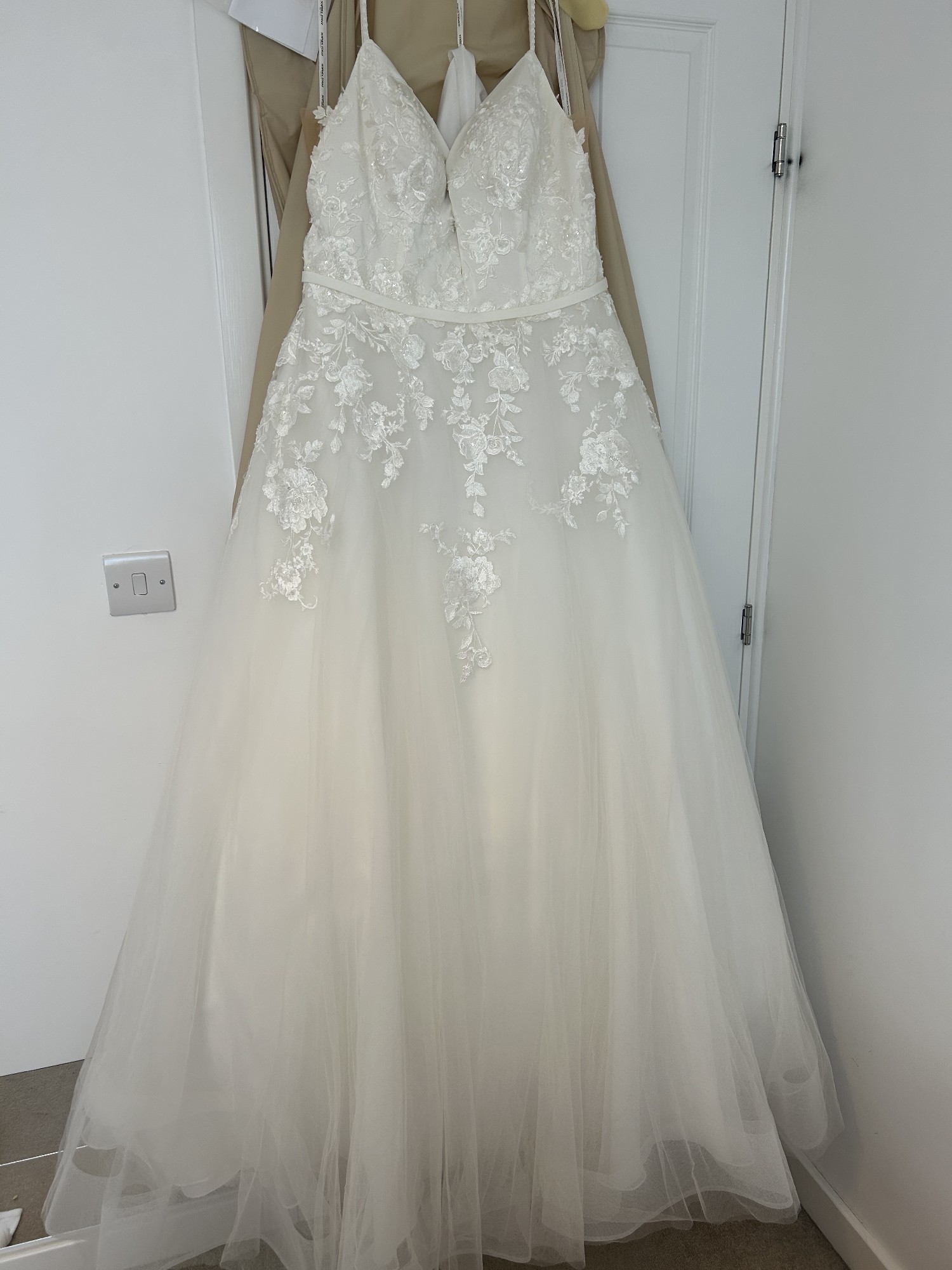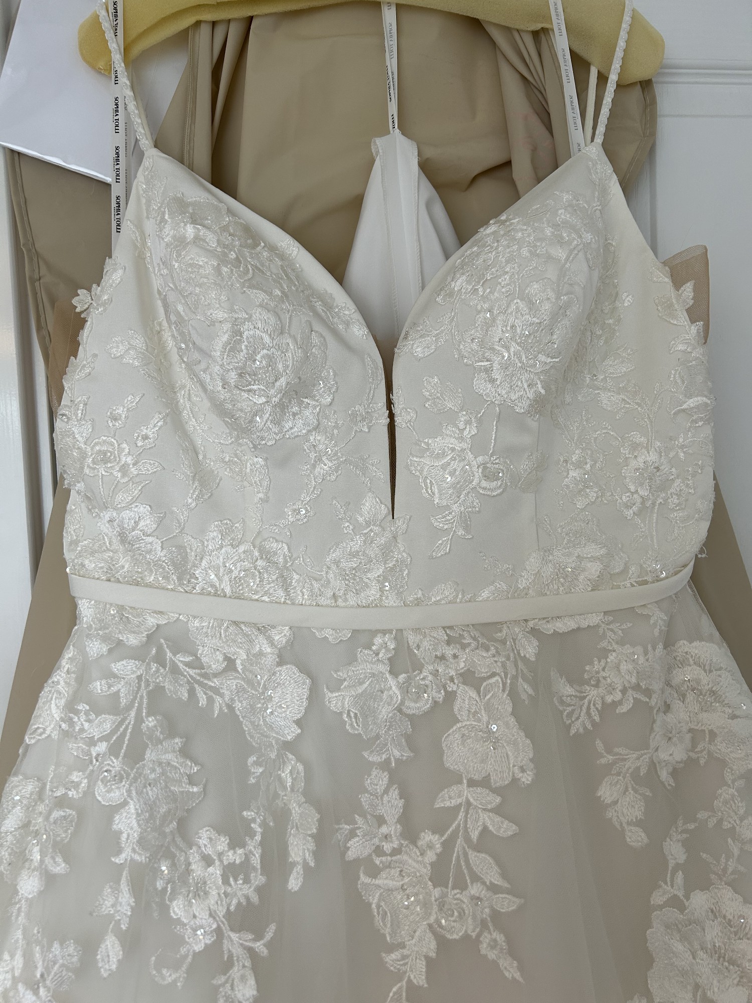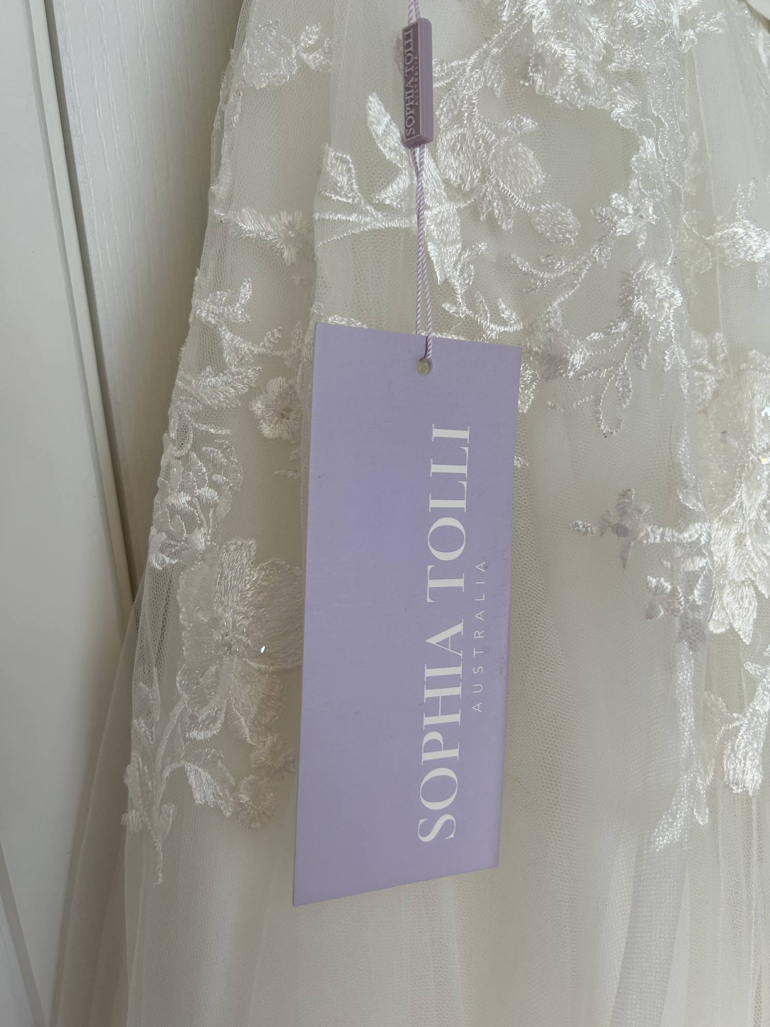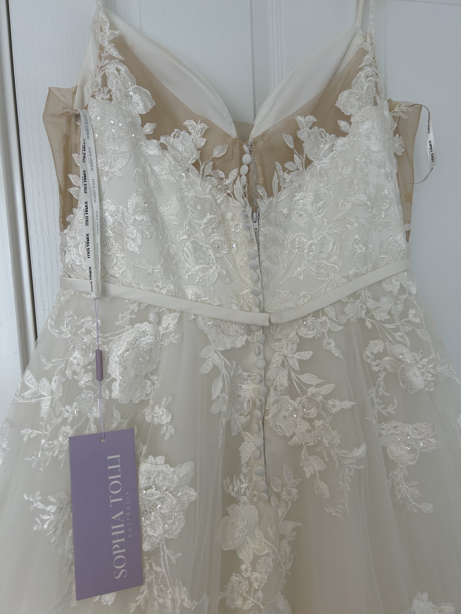 The dress is new with tags, bought but wedding was postponed and now have a new dress.