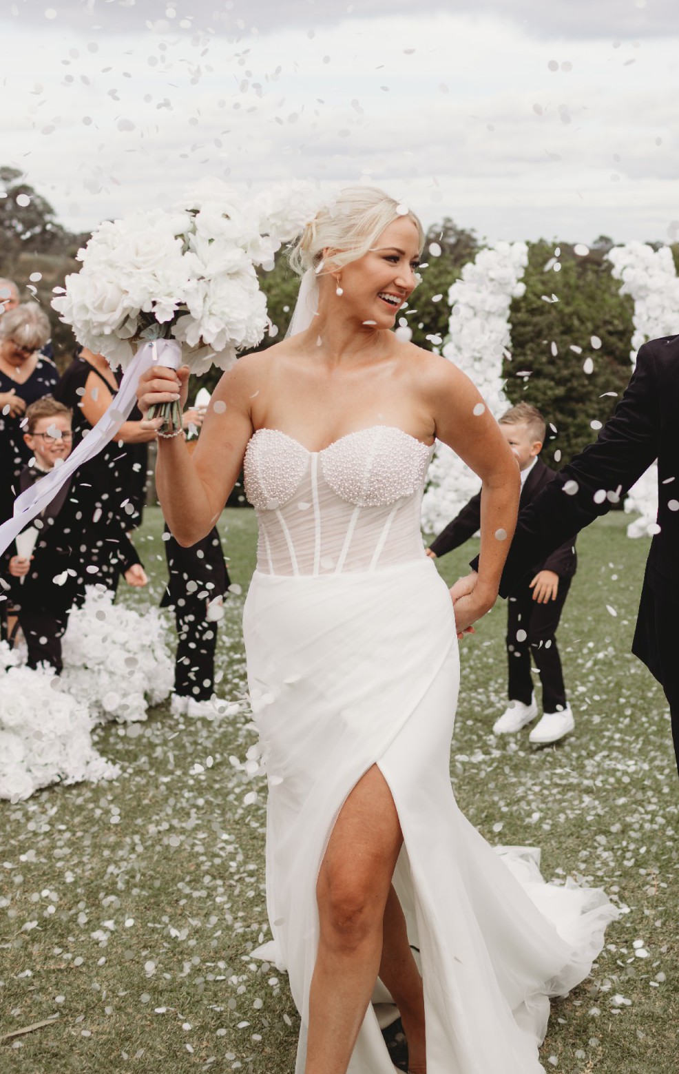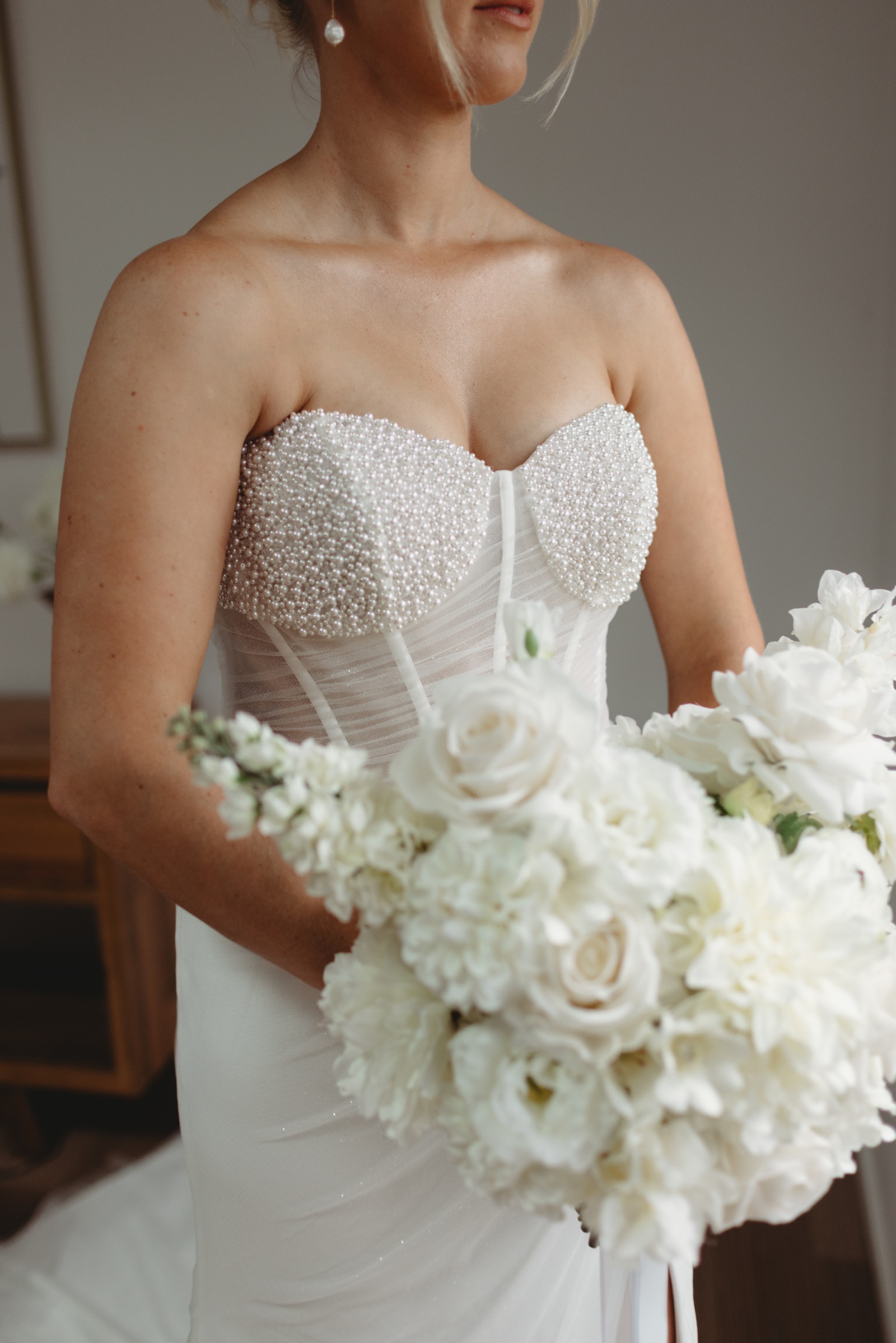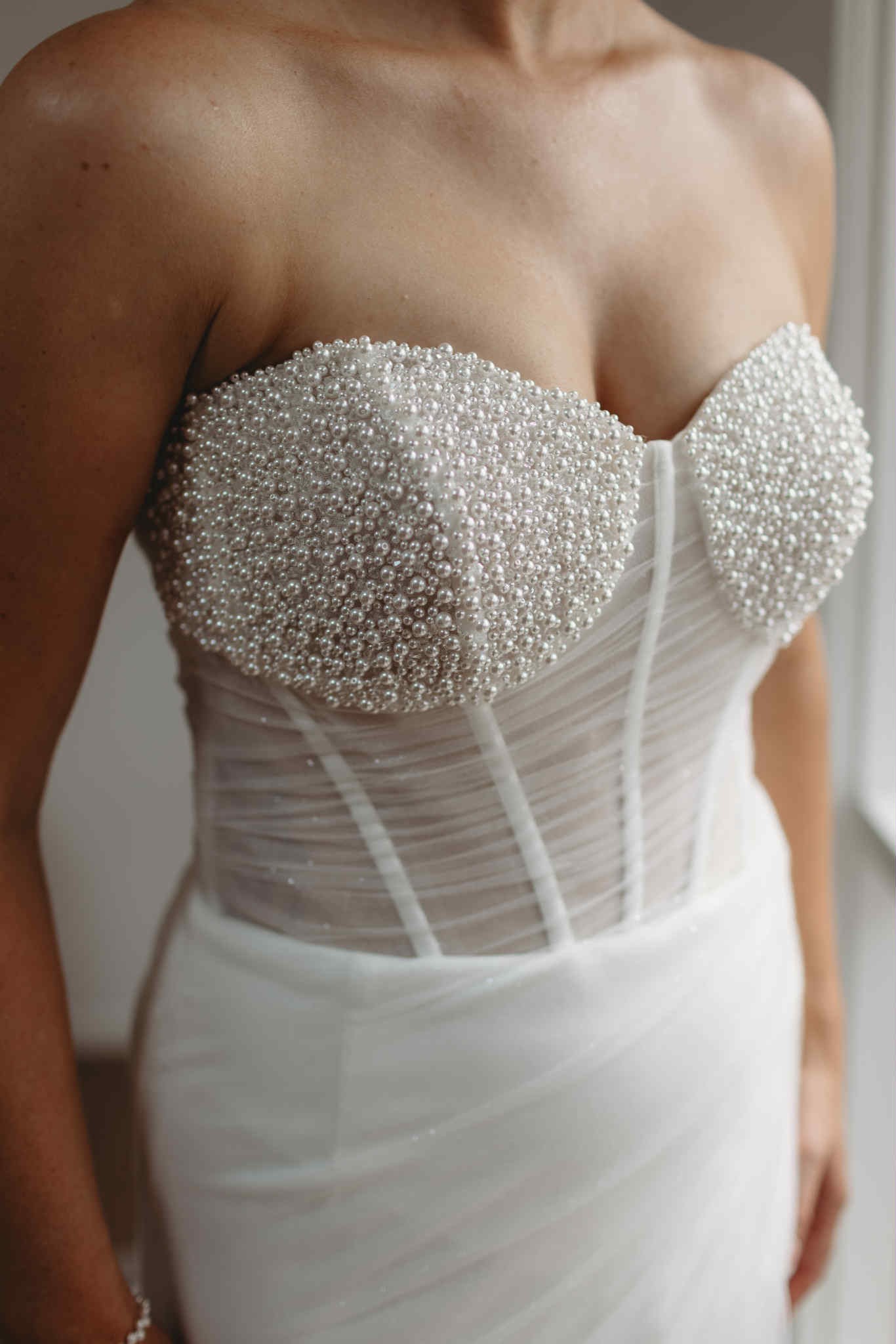 Modern fit & flare with pearlcore corset + optional cathedral veil