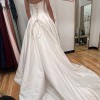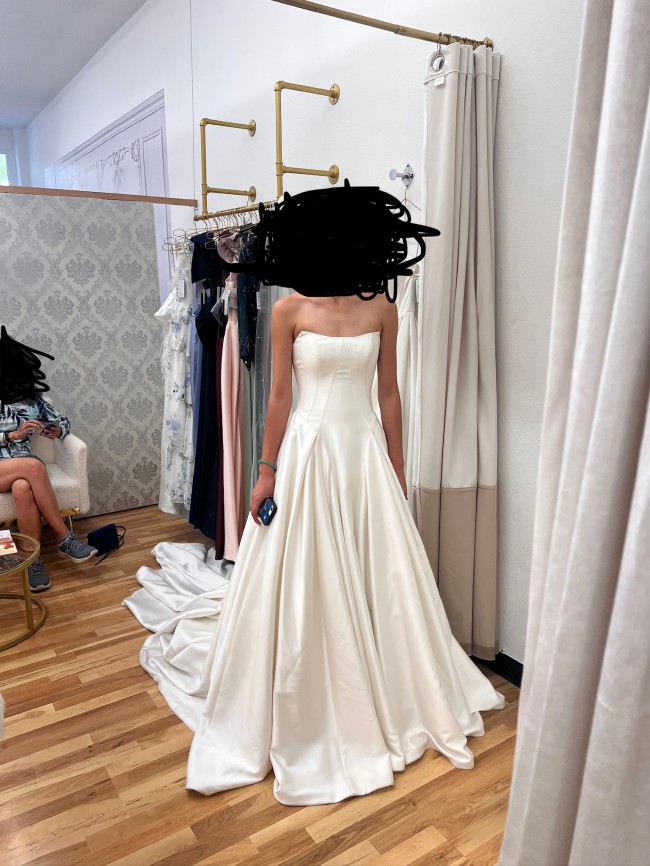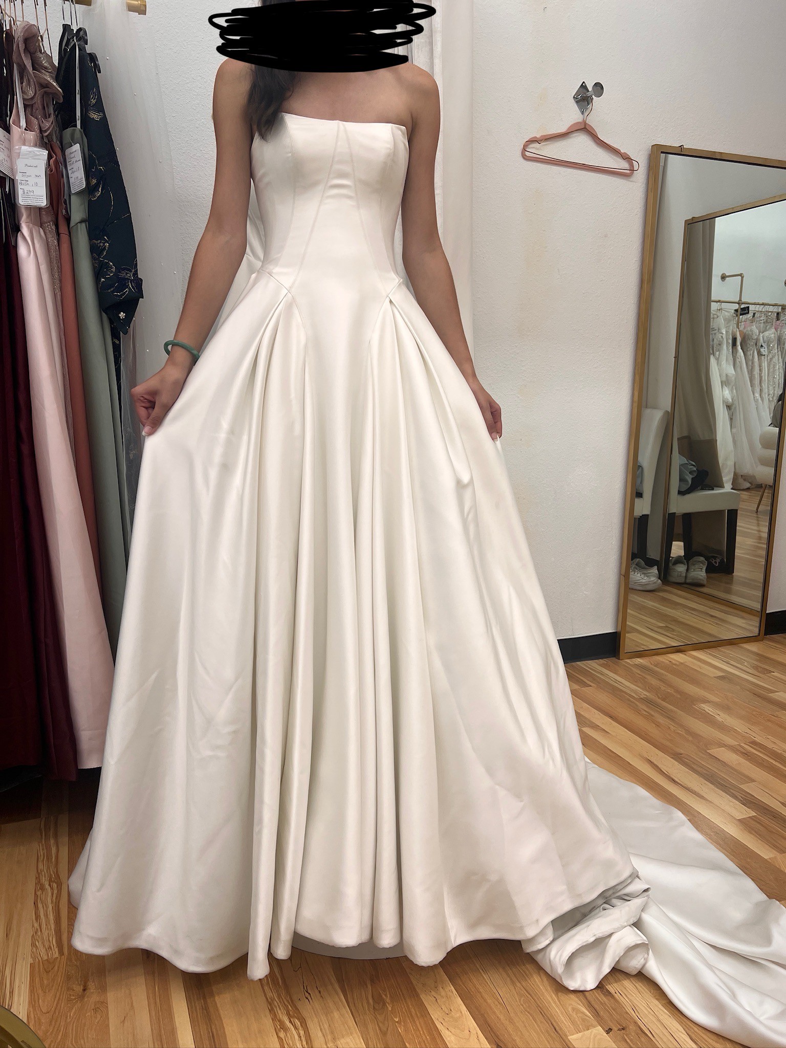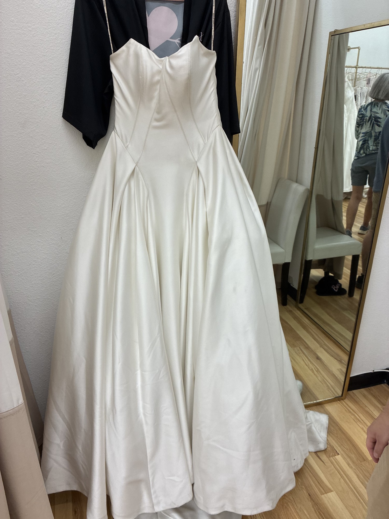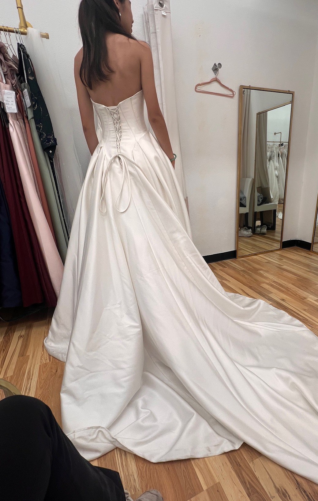 Gorgeous Maggie Sottero Fortune gown in the shade ivory! Has a really pretty corset like tie detail on the back. Bought it at a sample sale but realized it wasn’t the one. Has not been altered and has some signs of use on the bottom of the dress plus stain on the back corset tie but that can be dry cleaned out!