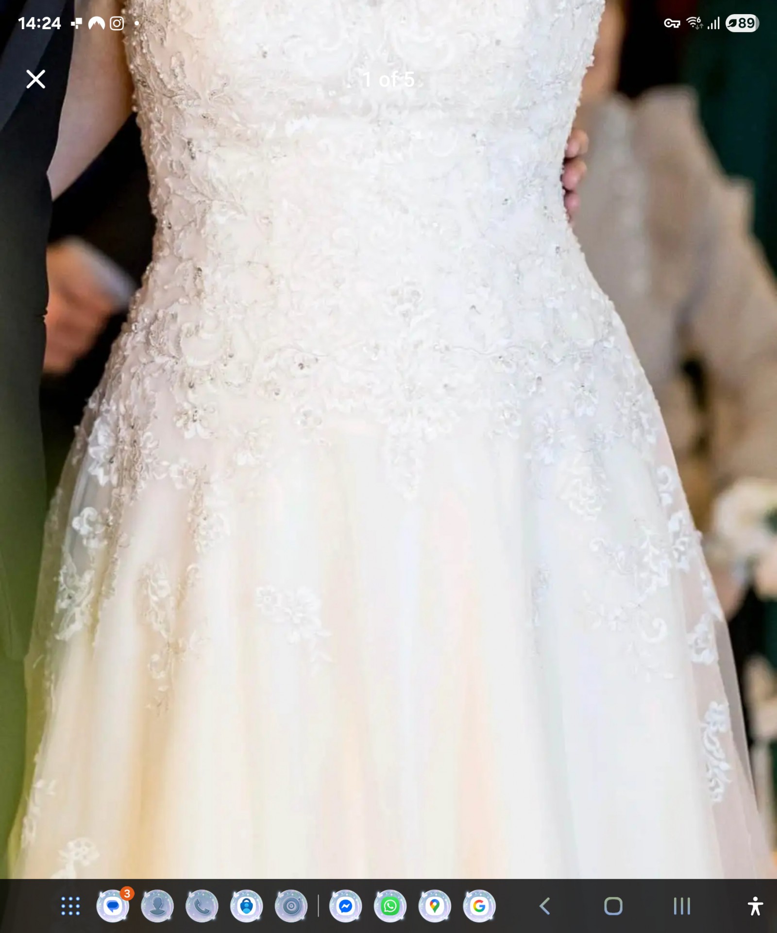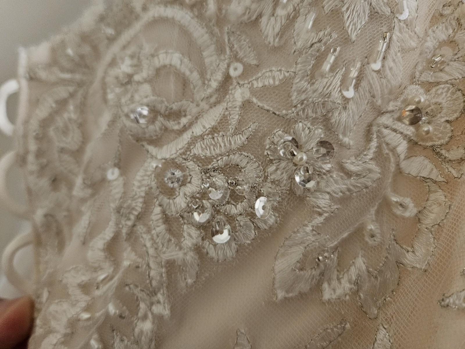 The detail is spectacular and the colour is ivory blush, she looked stunning in it.