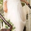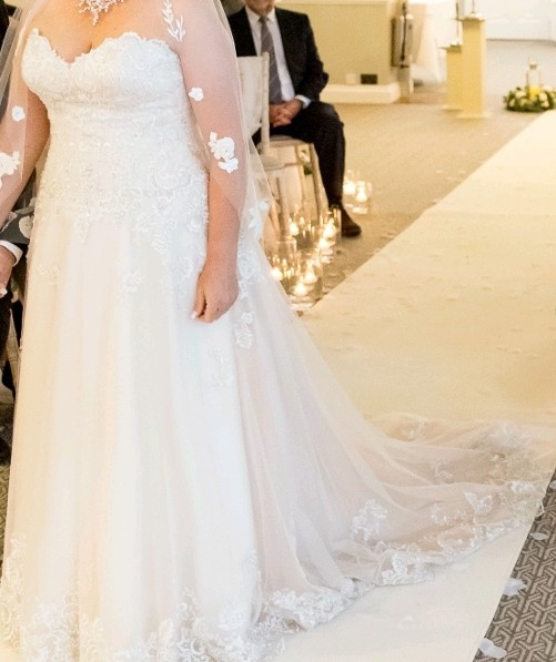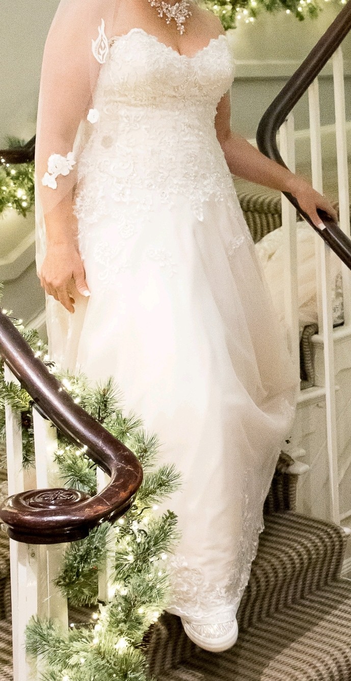 This is my wife's beautiful dress. We had it professionally altered adding a corset back allowing it to fit beautifully across a size up or down.