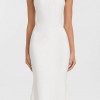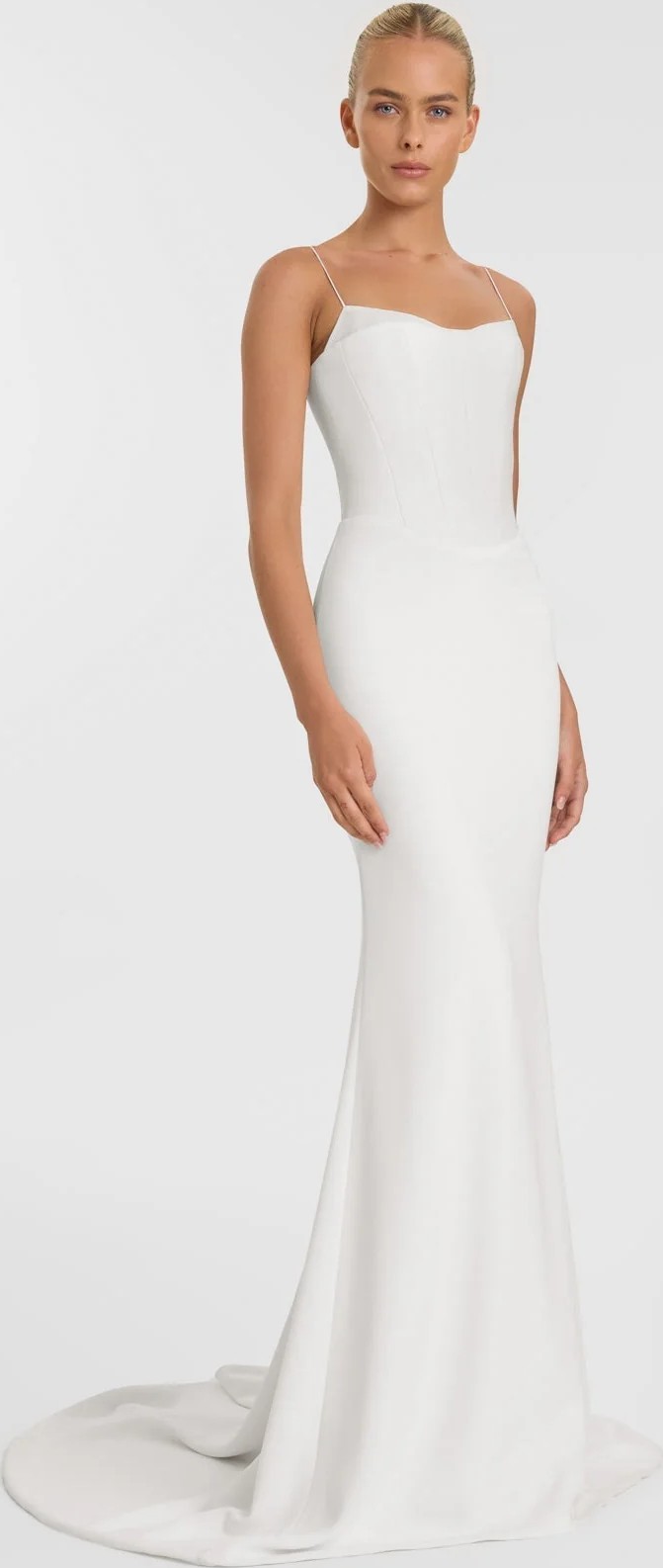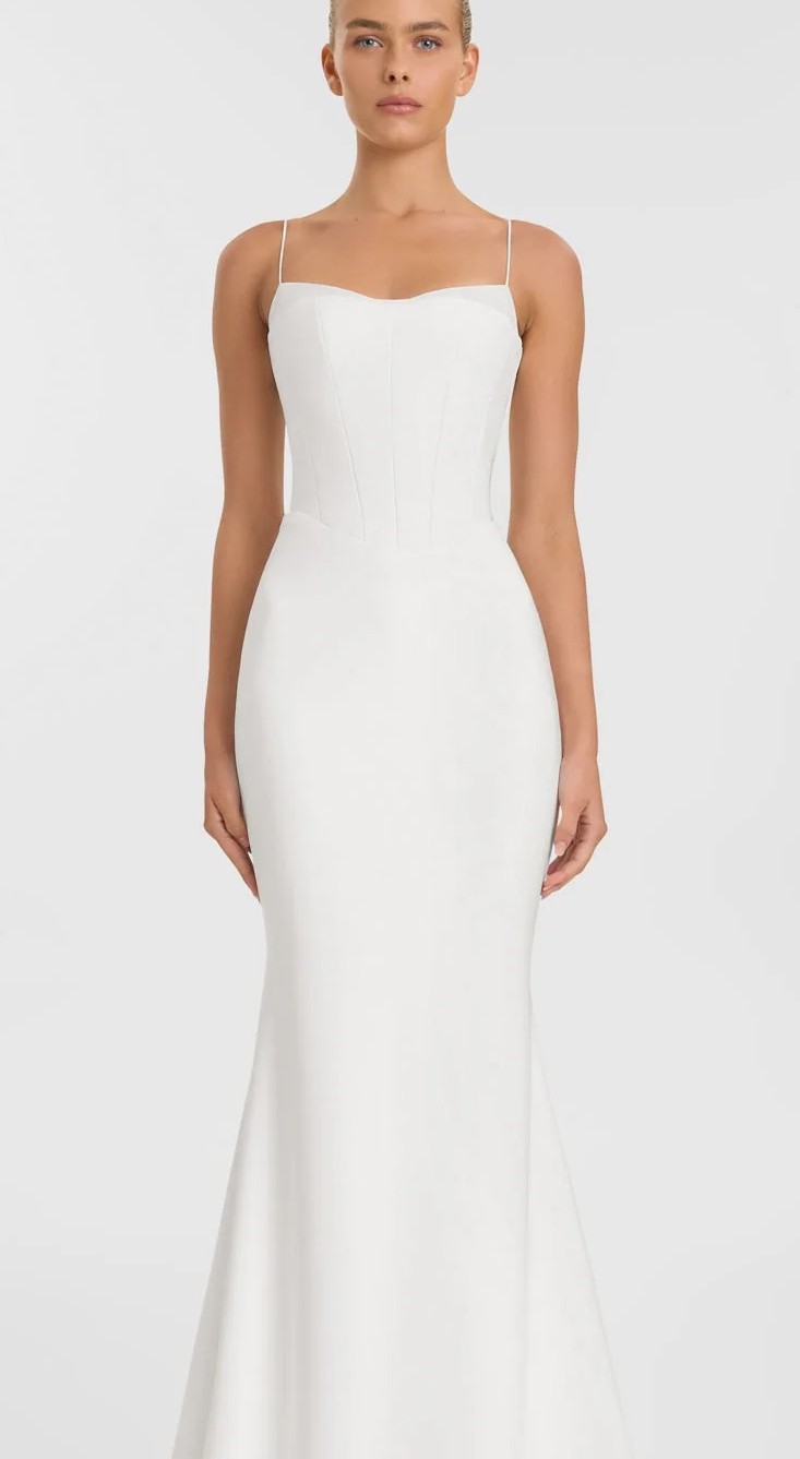 Nineties revivalism complete thanks to the luxe and layered Moritz. A new crepe fabrication sees a dipped waist, structured bodice and fit and flare skirt seamlessly sculpt the body. The straight neckline is layered over a whisper of spaghetti-strapped chiffon for the ultimate 90s-inspired aesthetic.