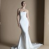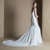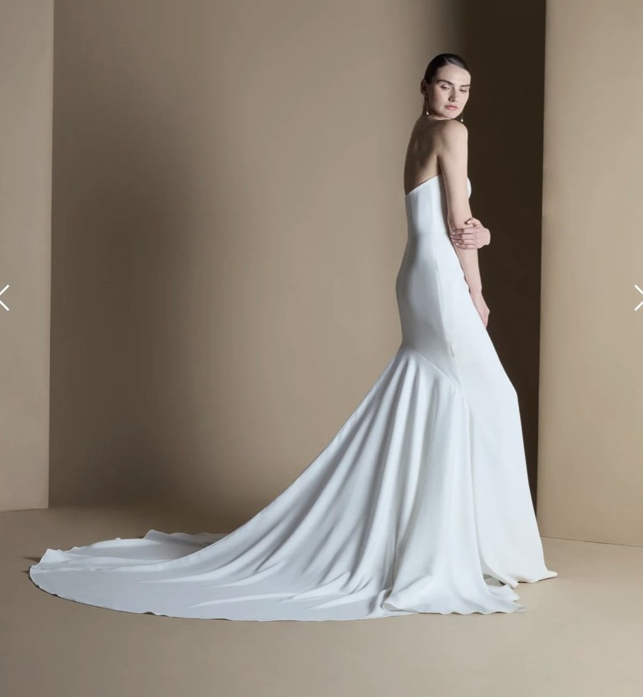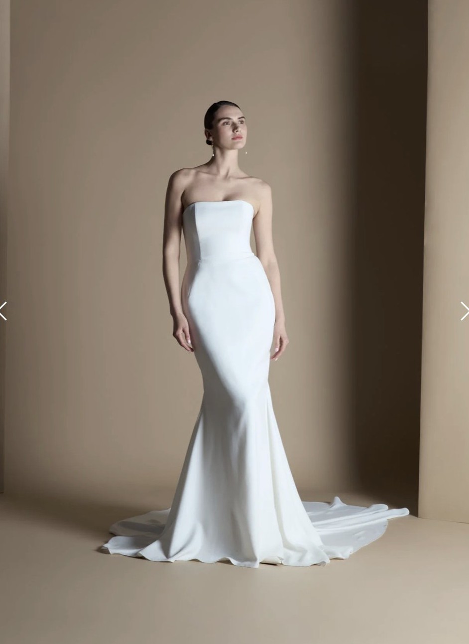“The clean lines of the Equinox dress pool into a beautiful train, showcasing this crêpe back satin fabric and exaggerating the flattering fit-and-flare silhouette. Wear the Equinox on its own for an elegant look, or style with other pieces within the collection.”