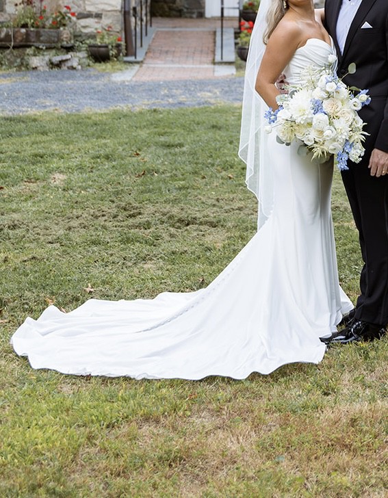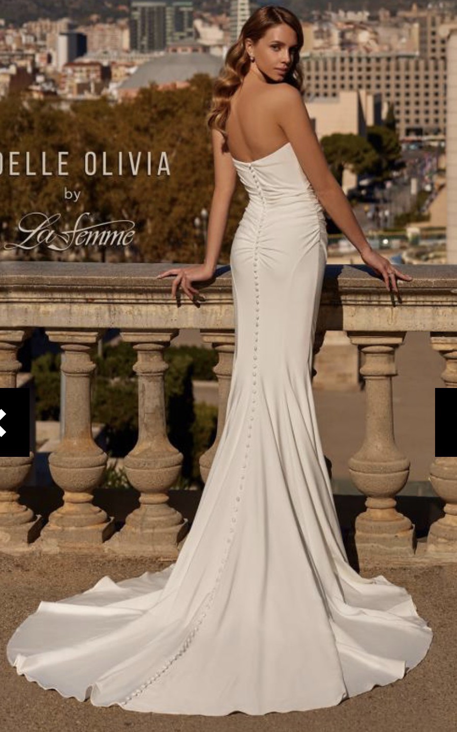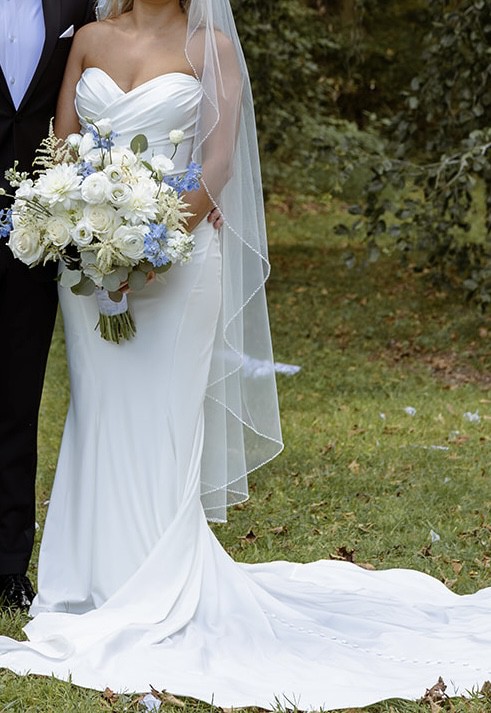 Elegant dress by Joelle Olivia. Dress has been discontinued, but it almost identical to the Kendall (J2210). Dress altered to fit a street size 2/4 and has a fairly stretchy fabric. Altered to fit around 5’5 when in heels.