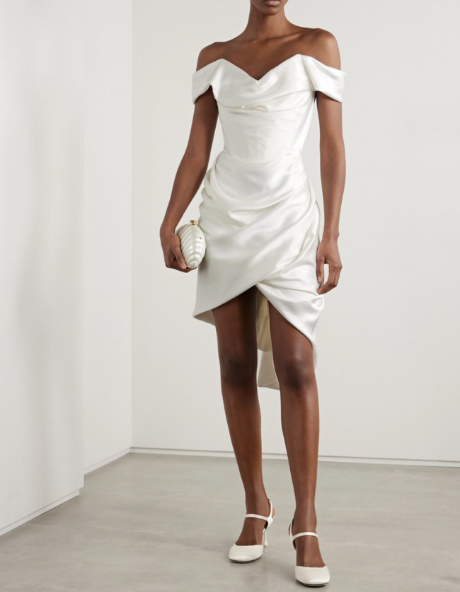 Vivienne Westwood knows exactly what it takes to make a bride feel and look her best - this 'Nova Cora' dress is such a beautiful choice for a rehearsal dinner or after-party. Inspired by the iconic silhouette of the 'Cocotte', it's made from lustrous satin-crepe that's draped along the neckline and hips and has an internal corset for structure and support.