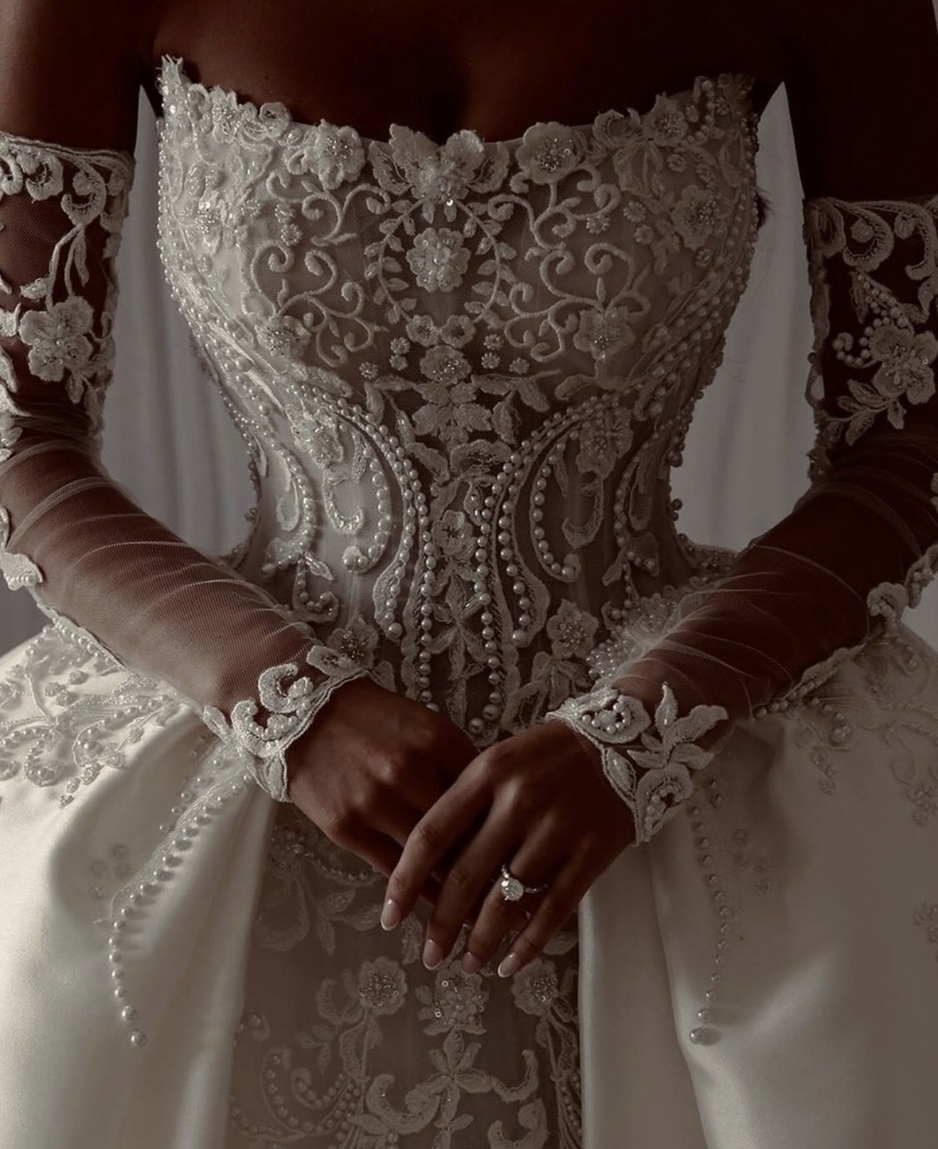 - Embroidered gloves/sleeves with crystals lace and pearls