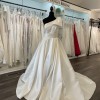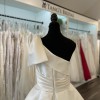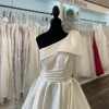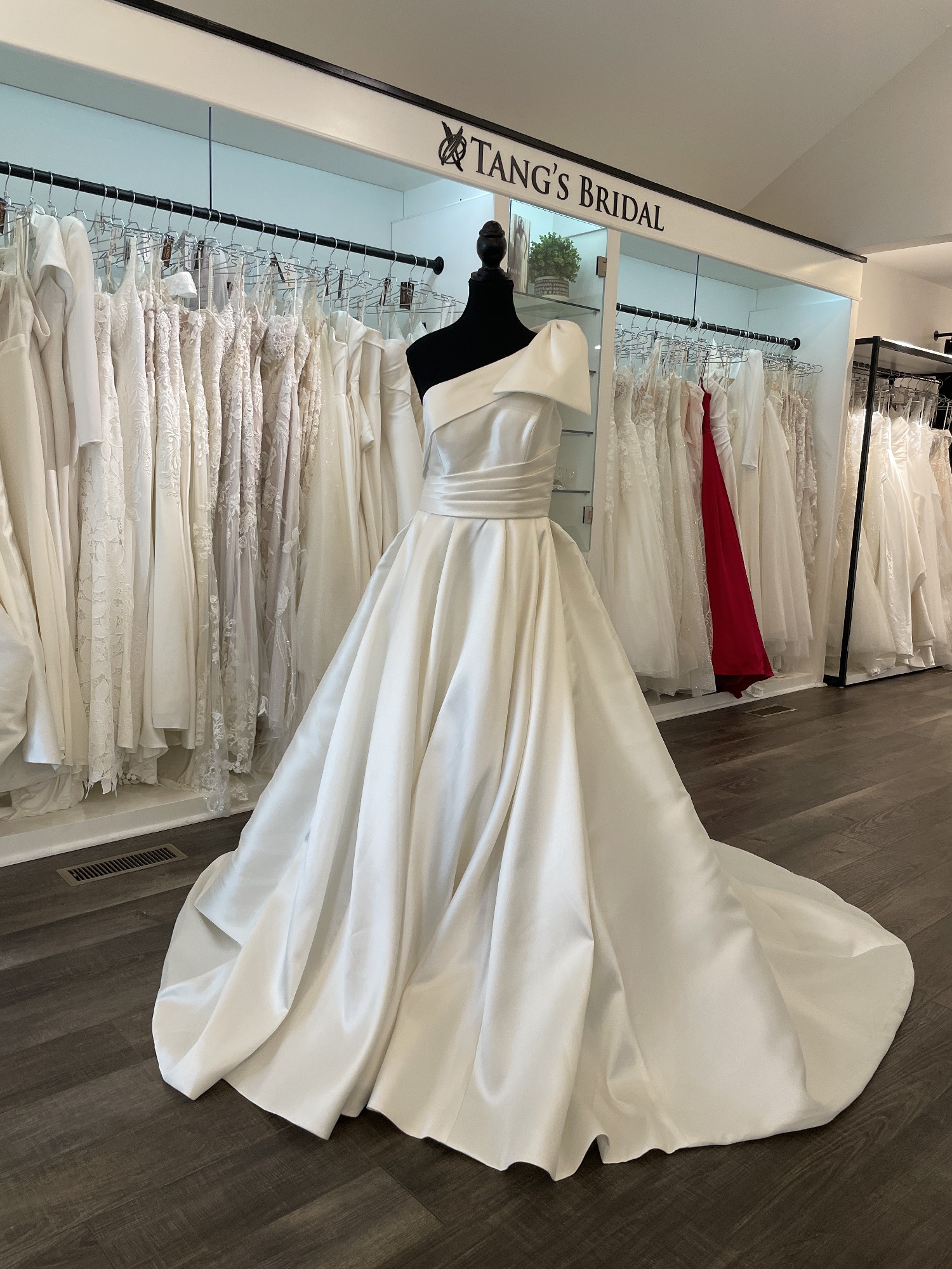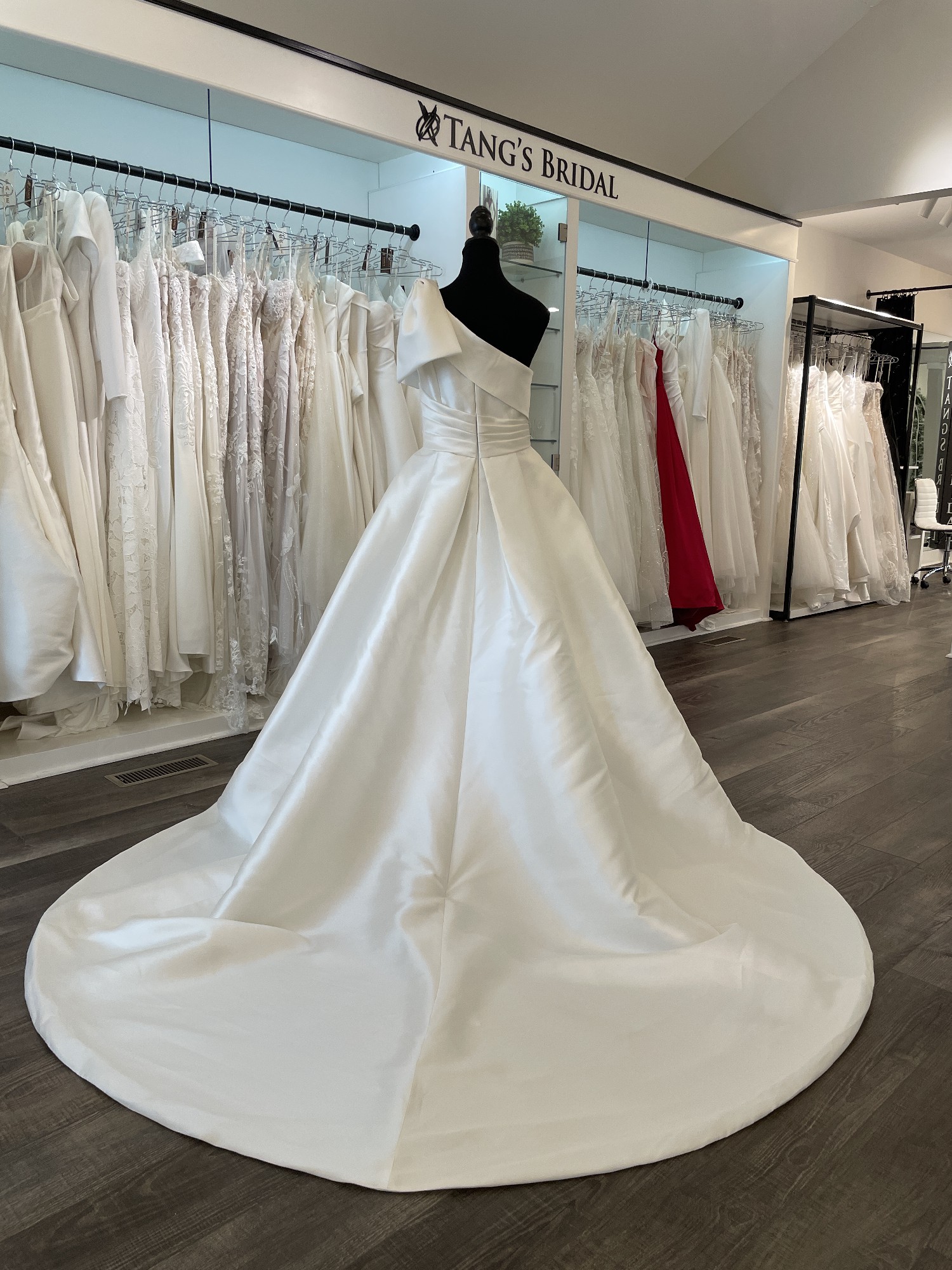A princess-cut Mikado wedding dress from Pronovias! This dress has an asymmetrical one-shoulder neckline with a shoulder bow detail. It even has pockets!!