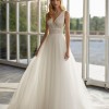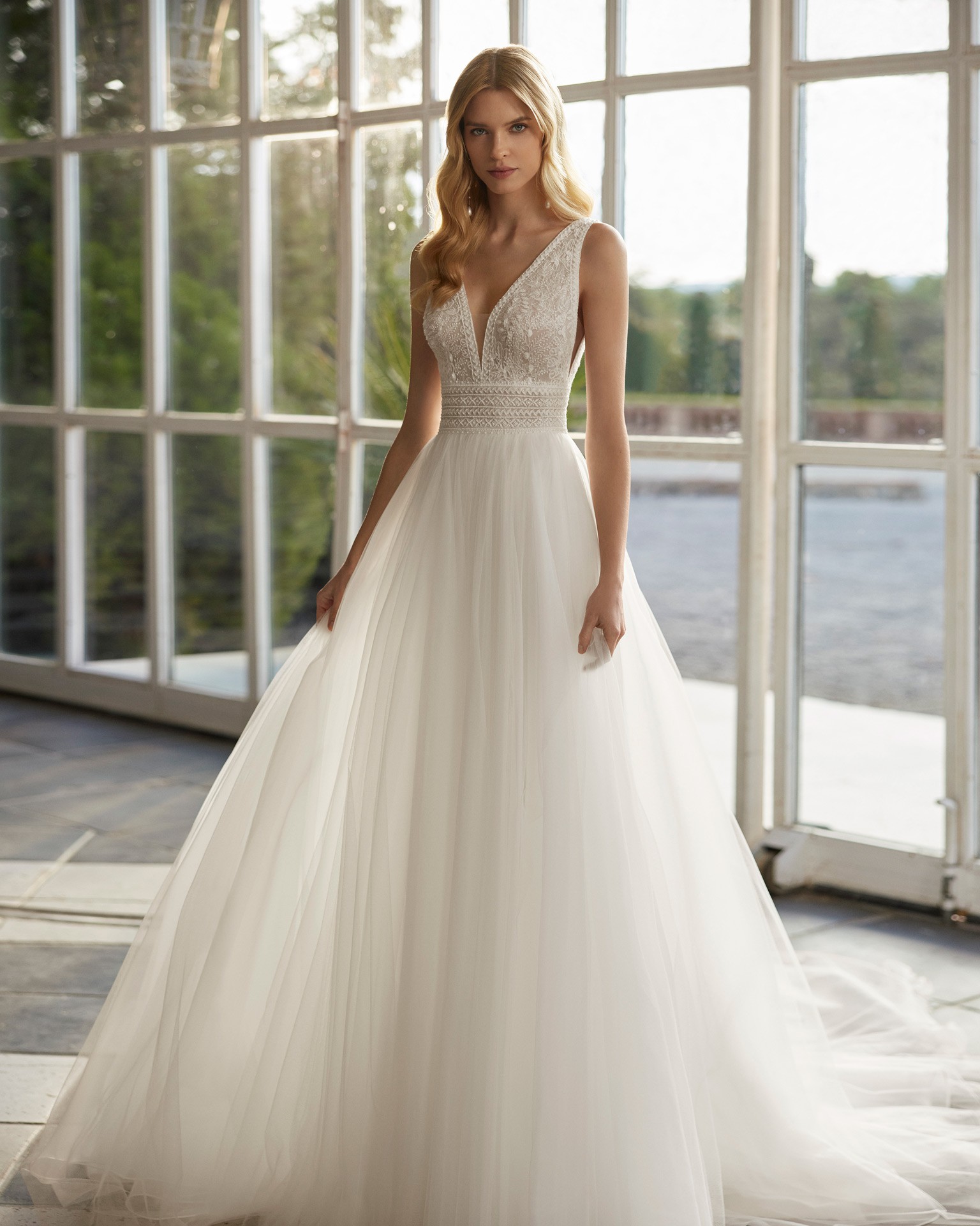 Princess style dress by Aire Barcelona, 2025 collection. The skirt is made of organza and tulle, and the bodice, tulle and lace. V neckline and V low back. It´s a store sample, in good conditions, not been altered.