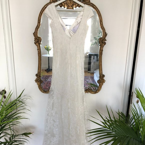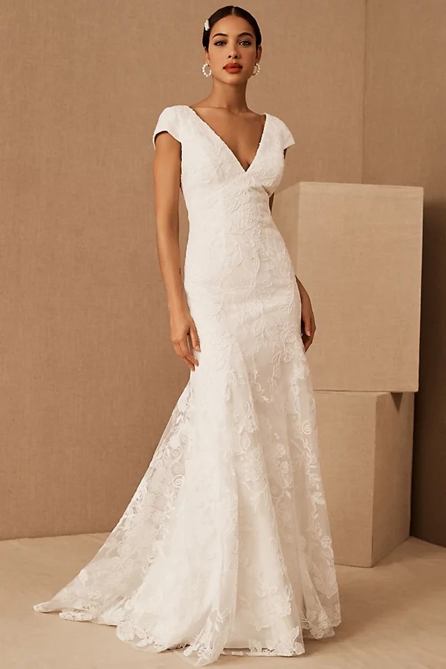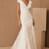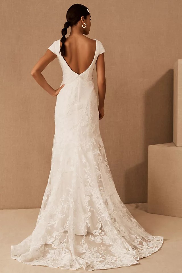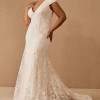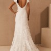 A layer of corded lace floats atop this timeless gown, flowing effortlessly into a sheer train. Cap sleeves, a classic V-neckline, and a low back complete the look.