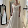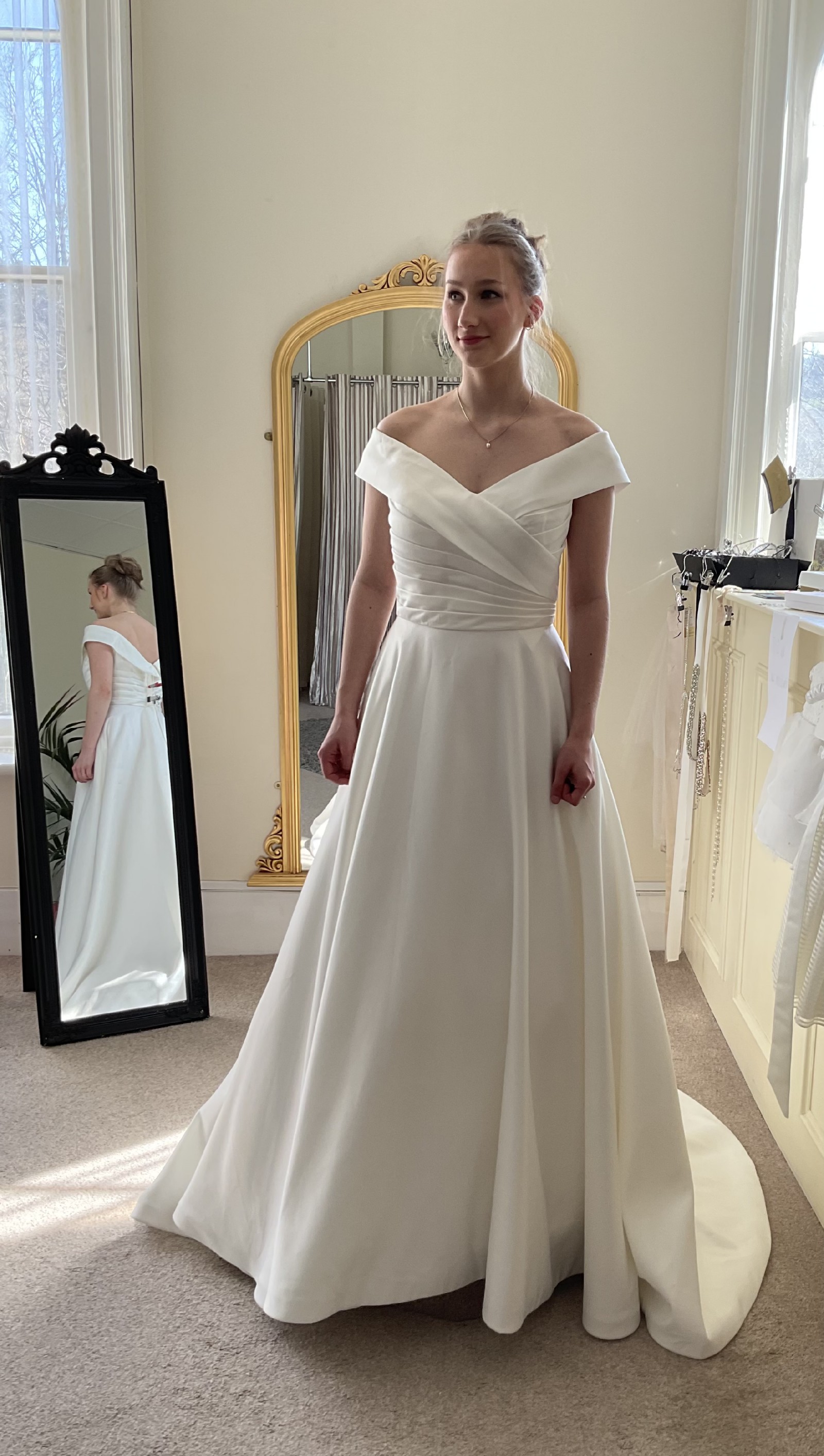 Elegant bridal gown with Bardot neckline and zip up back, fabric is satin and it has pockets in the skirt , the ruched bodice is very flattering. This dress has been tried on but never been altered or worn as it was one of my shop stock dresses.