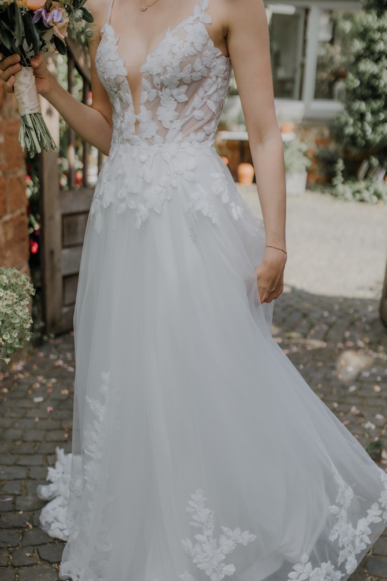 Das wunderschöne Kleid wurde von mir einmal getragen und danach professionell gereinigt. Ich habe das Kleid geringfügig in der Länge anpassen lassen, ich bin 1,70 m groß und trug Schuhe mit einem Absatz von ca. 5 cm.