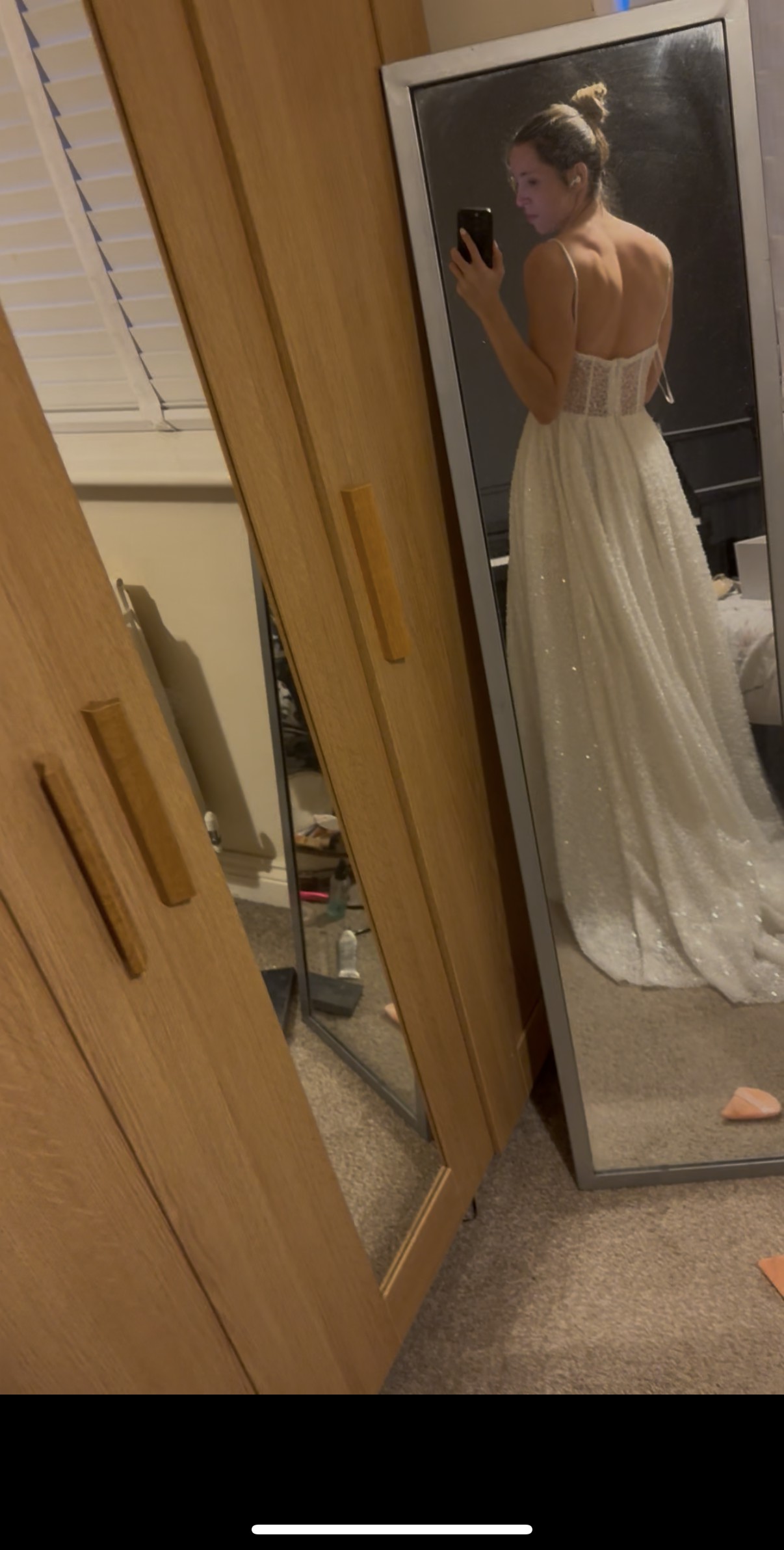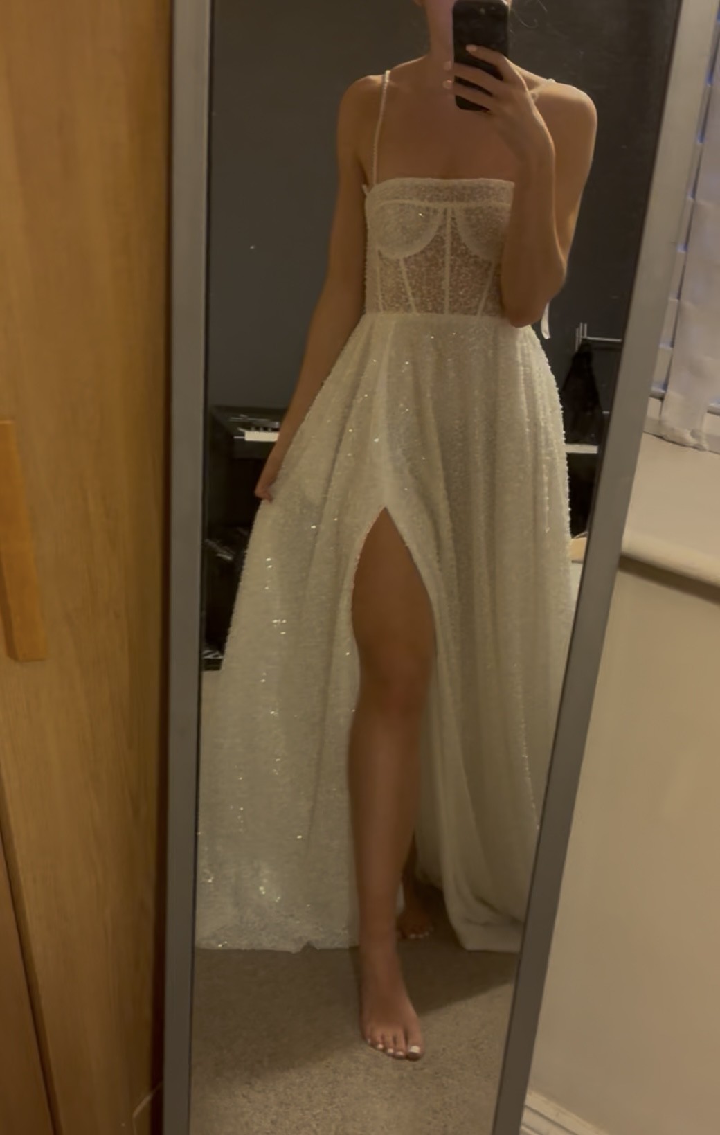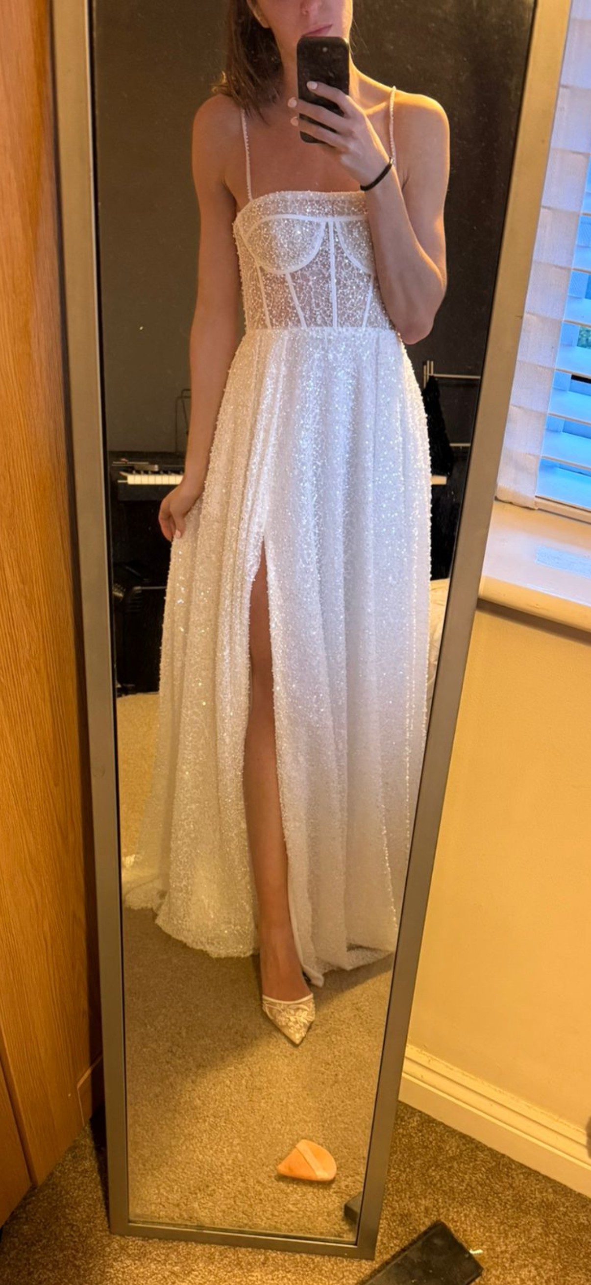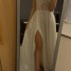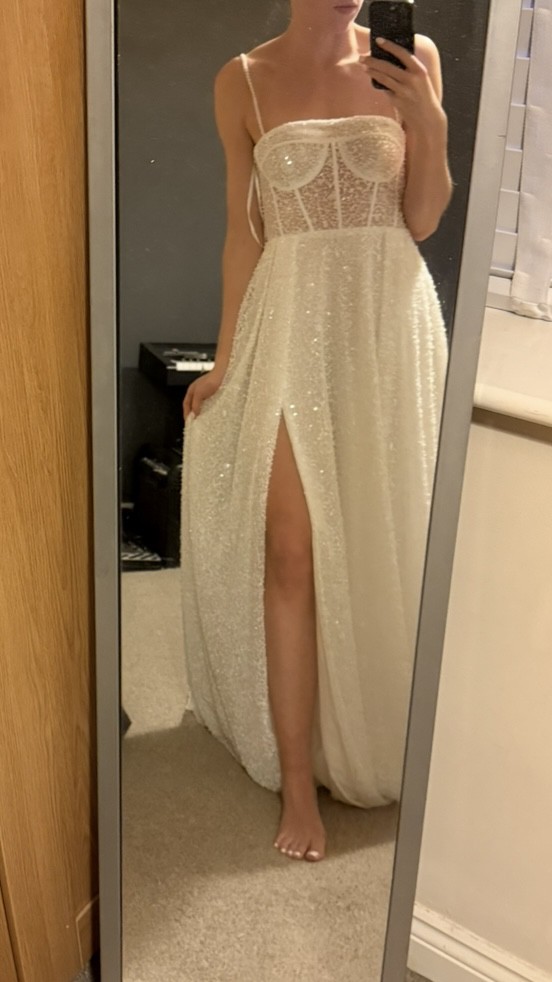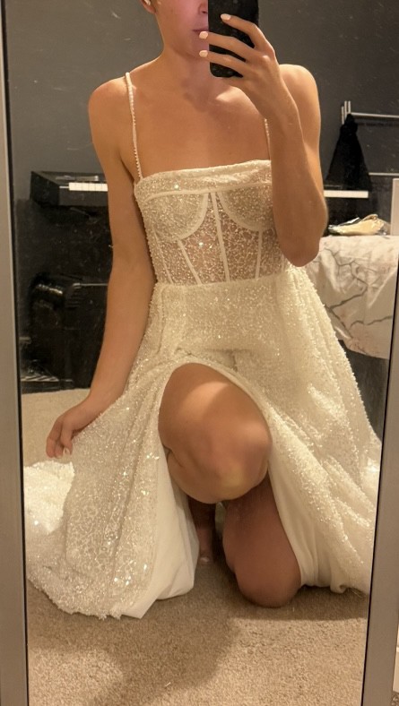 I absolutely love this dress — it’s elegant yet modern with its sparkly lace, structured bodice, and thigh-high slit. I bought it as a reception/second dress, but I’ve decided to wear my main gown all day, so sadly I won’t be needing this one