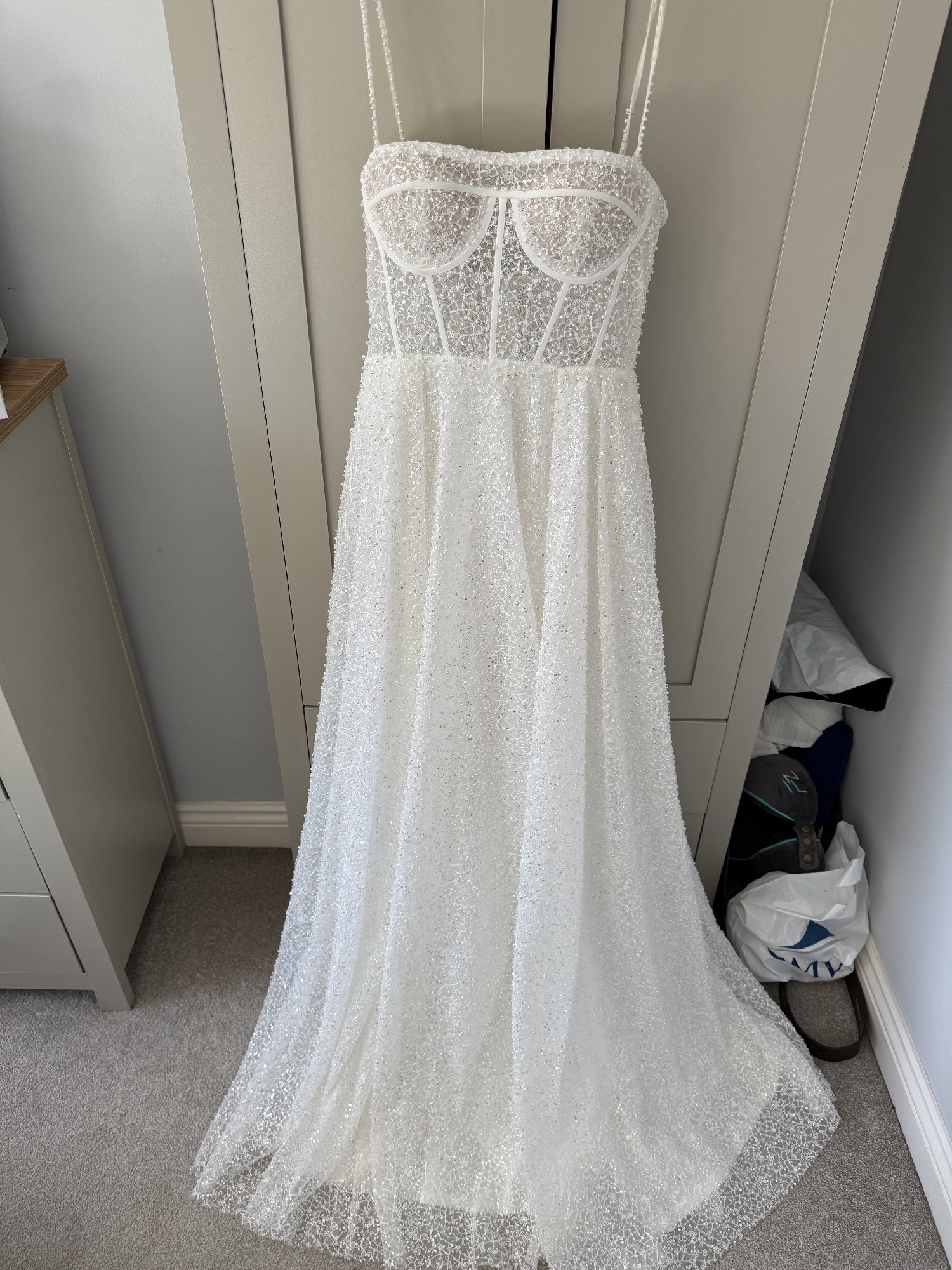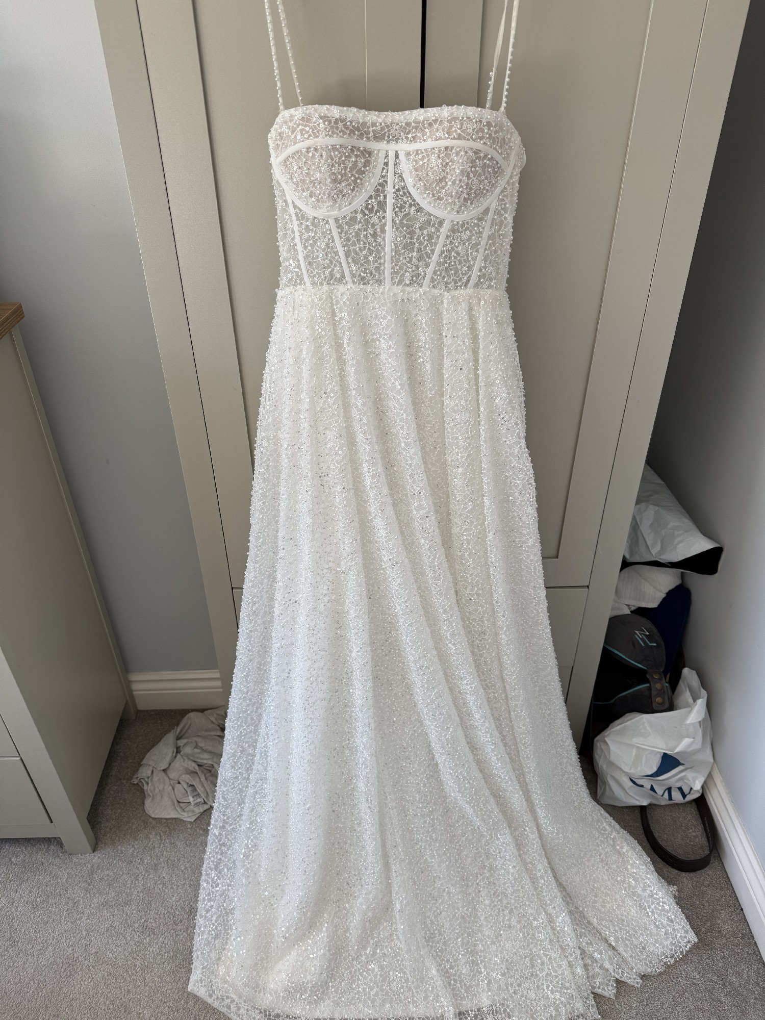 This dress retails for £2,700 but I purchased it as a sample in a designer sale. It’s unworn by me and completely unaltered, but as it’s a sample, it does have some minor imperfections (see image of detachable straps which are missing a few beads , priced accordingly )