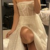 Features : Sparkly glitter tulle, structured corset bodice, slit skirt — the ultimate statement evening or second-dress.