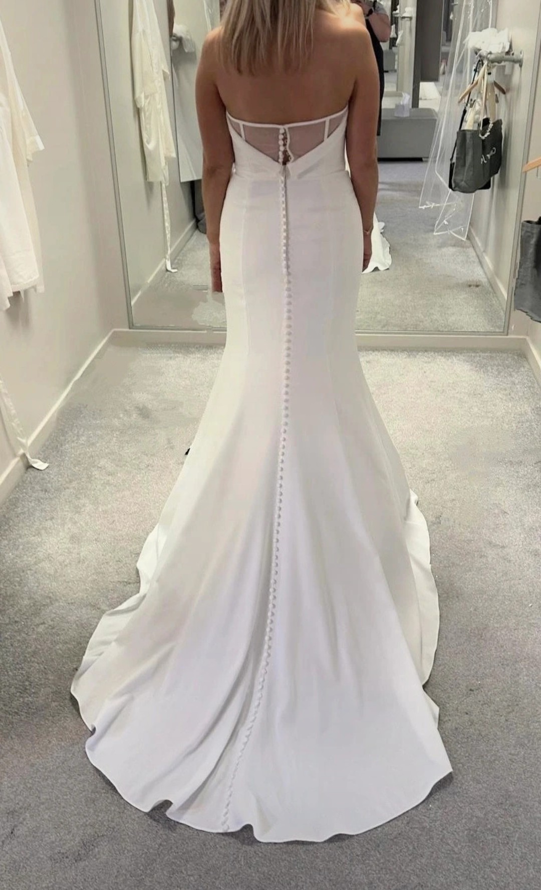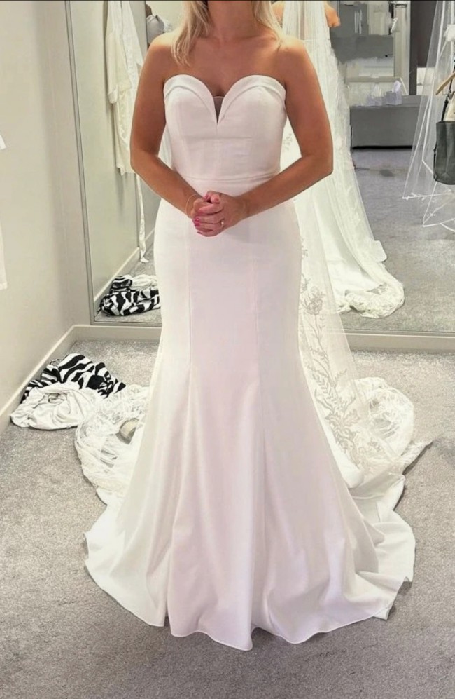 Brand new with tags. This Wed2b Leo Wedding Dress in size 12 is a brand new gown with tags, plus off the shoulder sleeves that can be attached with poppers. Perfect for a bride looking for a stunning and elegant look on her special day. Designed with a sweetheart neckline, this forgiving crepe fabric is very comfortable.