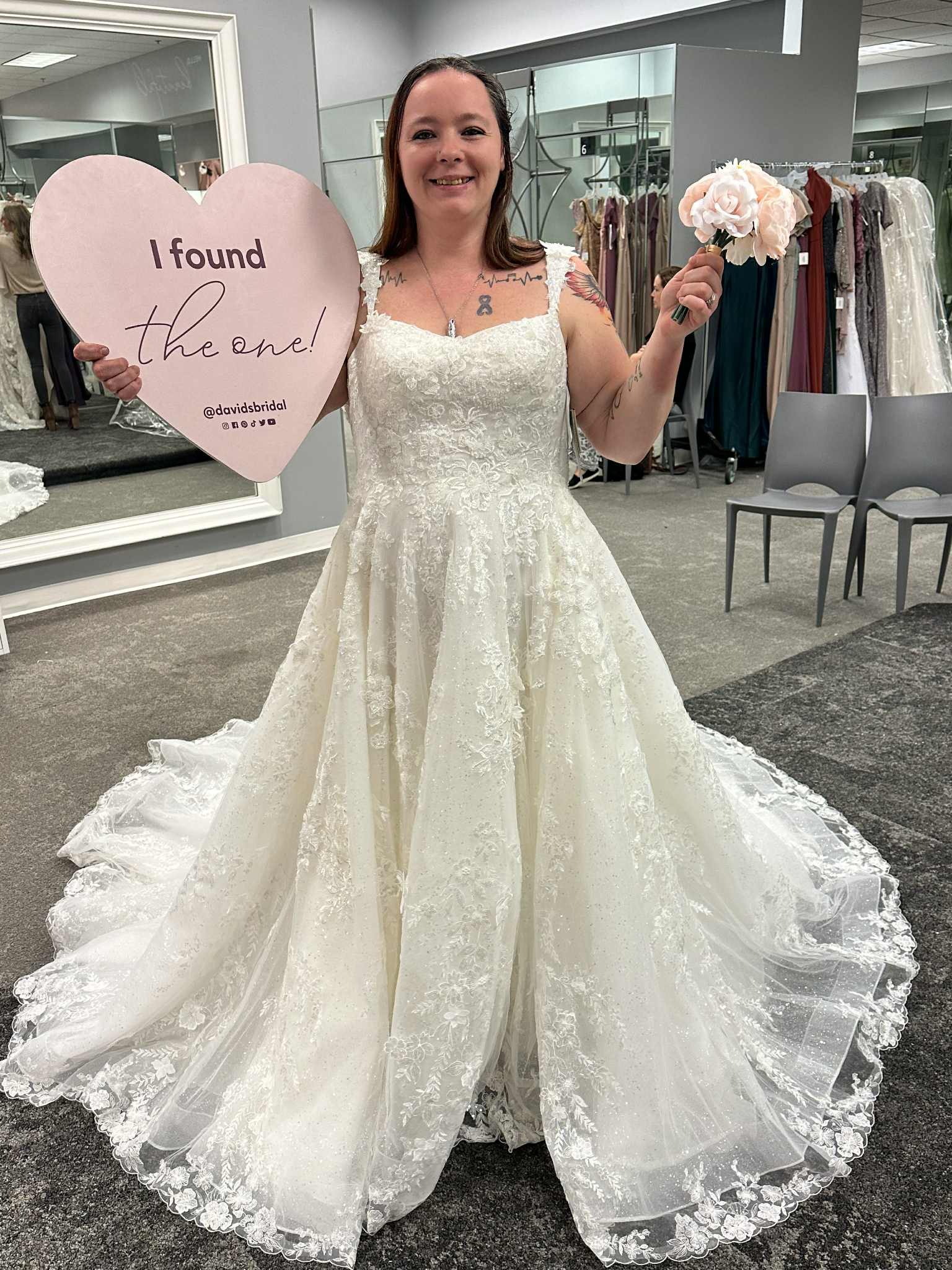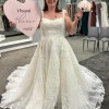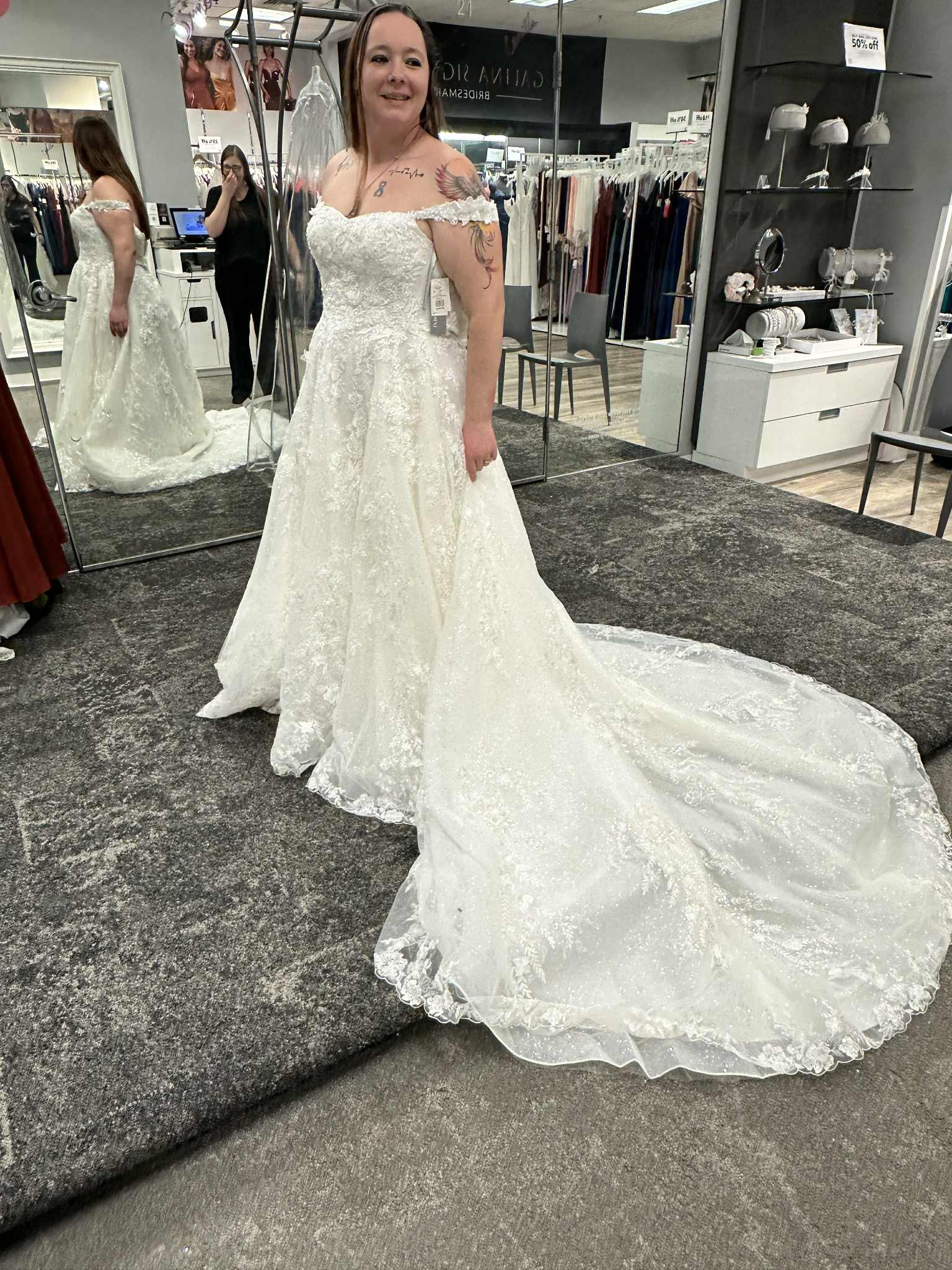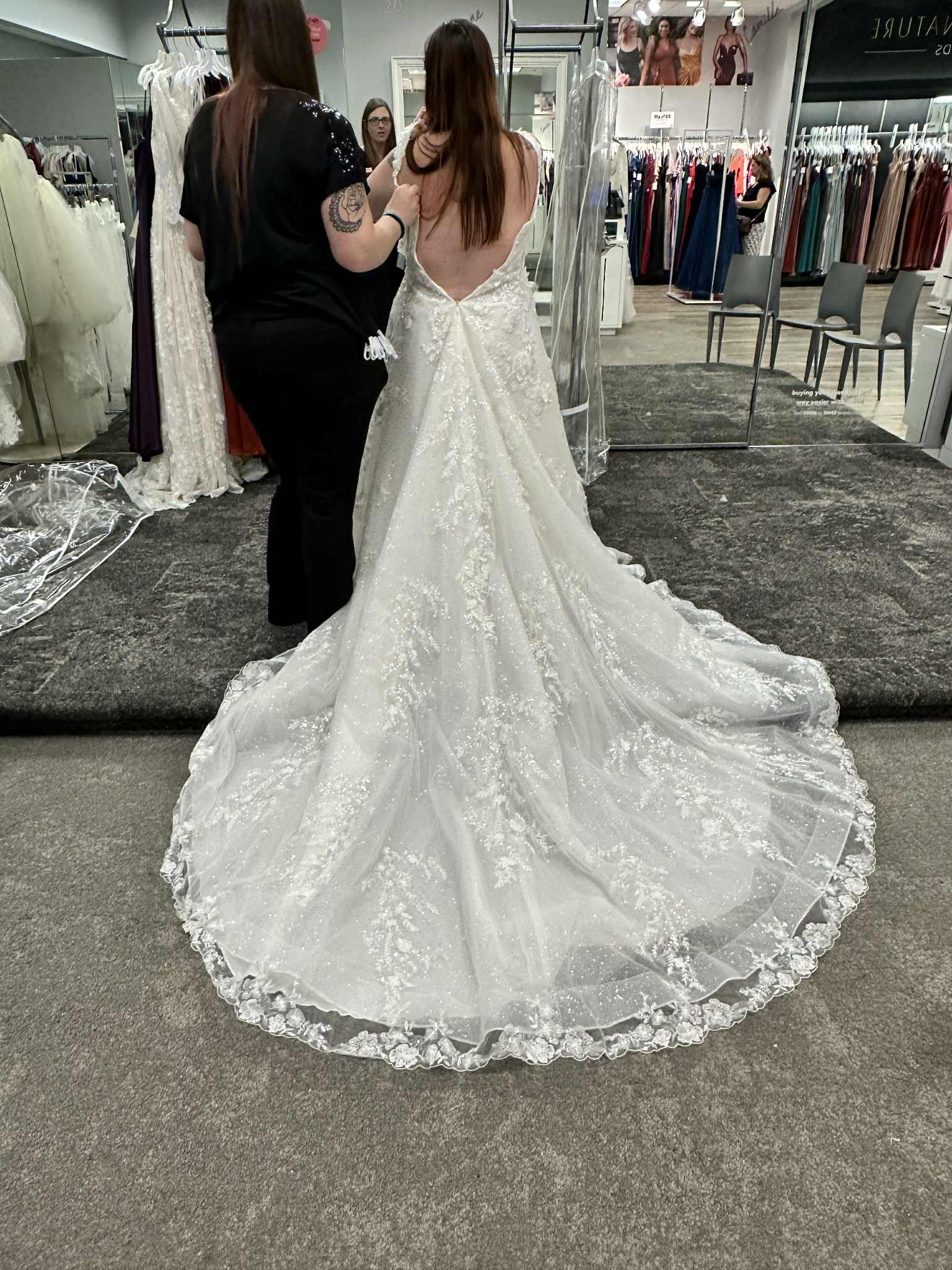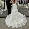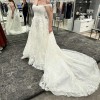 Dress has never been worn. The pictures are of the sample dress I tried on at the bridal store. The dress still has the tags on it and is in the bridal bag. It is in brand new condition. Size 16. It has not been altered in anyway.