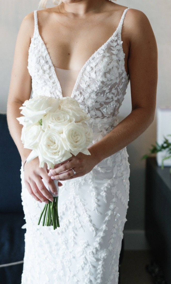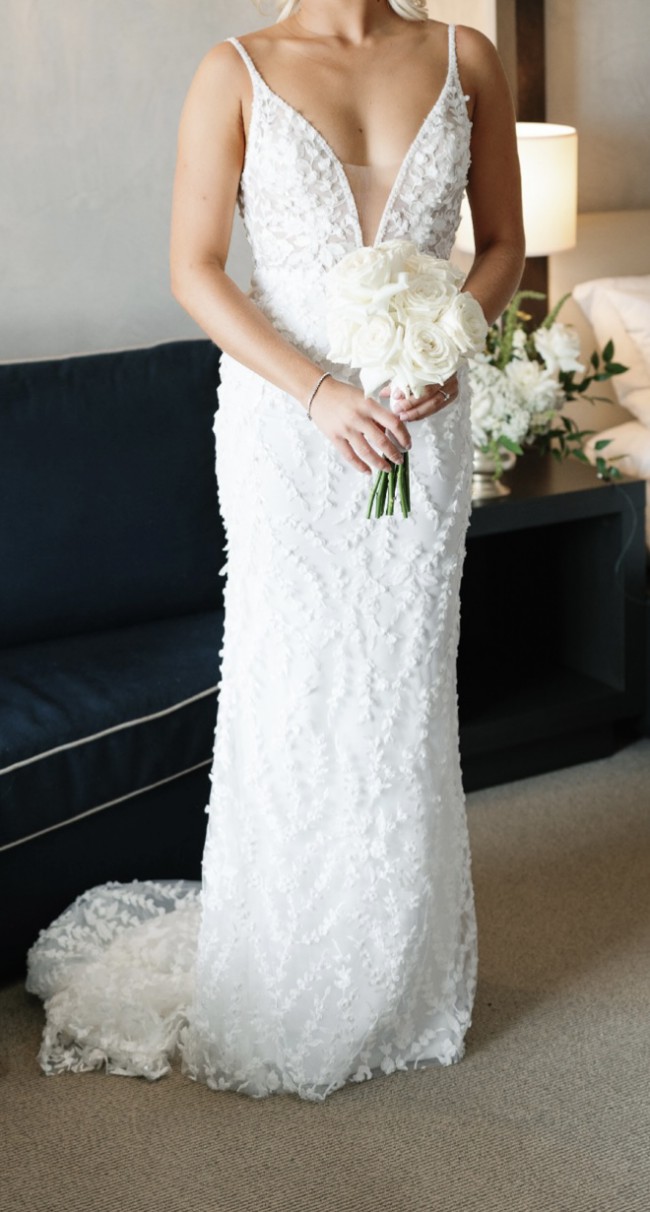 I originally purchased this dress from still white a few months ago but found a dress that better suits my frame. It’s only ever been worn once by the original seller, dry cleaned and stored. Below is the original description from the seller I purchased from! This breathtaking Made With Love wedding dress is the epitome of elegance and romance. In a timeless shade of white, the delicate fabric beautifully embraces every curve, enhancing the trumpet silhouette that effortlessly flows into a stunning floor-length train. The V-neckline adds a touch of allure, while the low back seduces with just the right amount of drama. With exquisite pearl details that shimmer softly in the light, this gown captured my heart and made me feel like the most beautiful version of myself on my special day. The slender straps provide support while accentuating the elegance of the design. Each moment I wore it was filled with joy, laughter, and love, and I want to pass on that magical experience to another bride-to-be. This size 8-10 dress is ready to create new memories and make someone feel just as radiant. If you're searching for a show-stopping gown that combines classic sophistication with modern charm, this is the dress for you. Let your love story shine in all its beauty with this stunning piece. No Bra required. Padding insitu. Dry cleaned. Non smoker home. In excellent condition. Please note that the dress is 155cm long from the top of the straps to the bottom of the dress (front).
