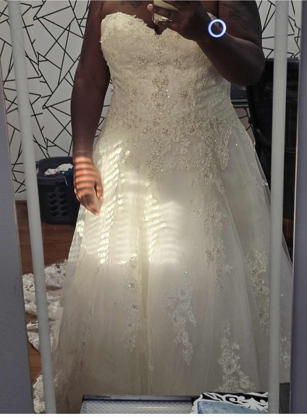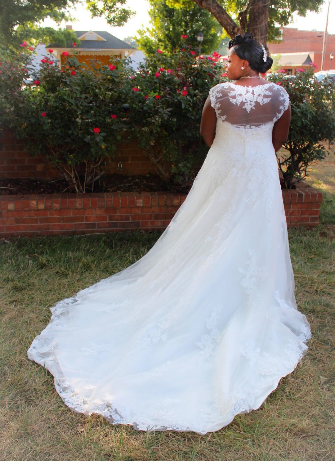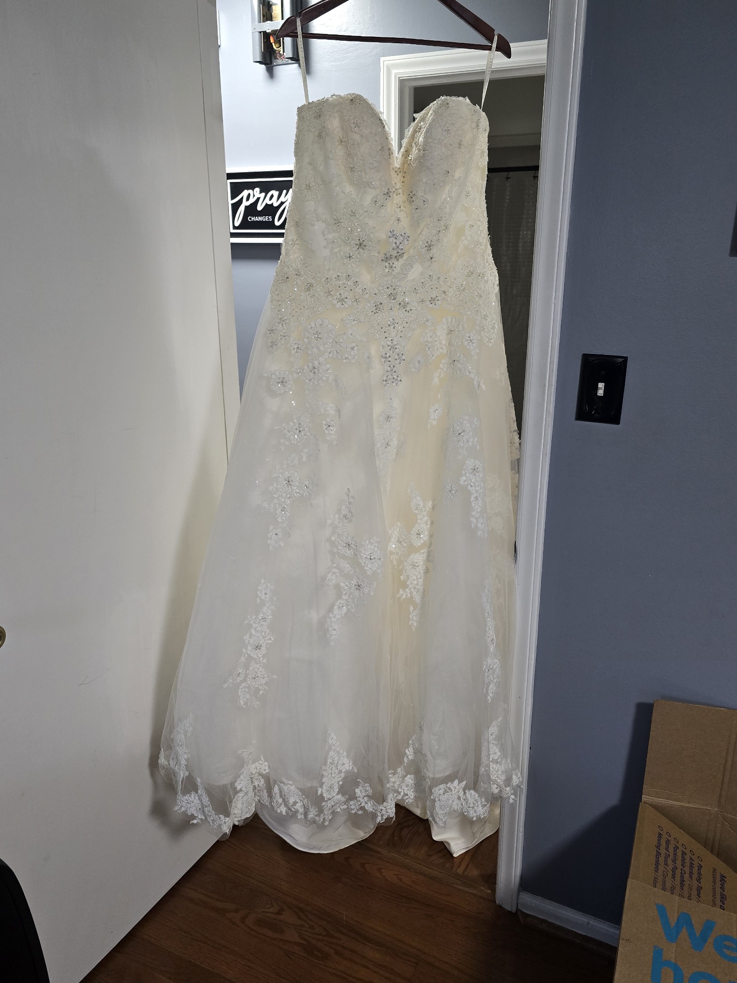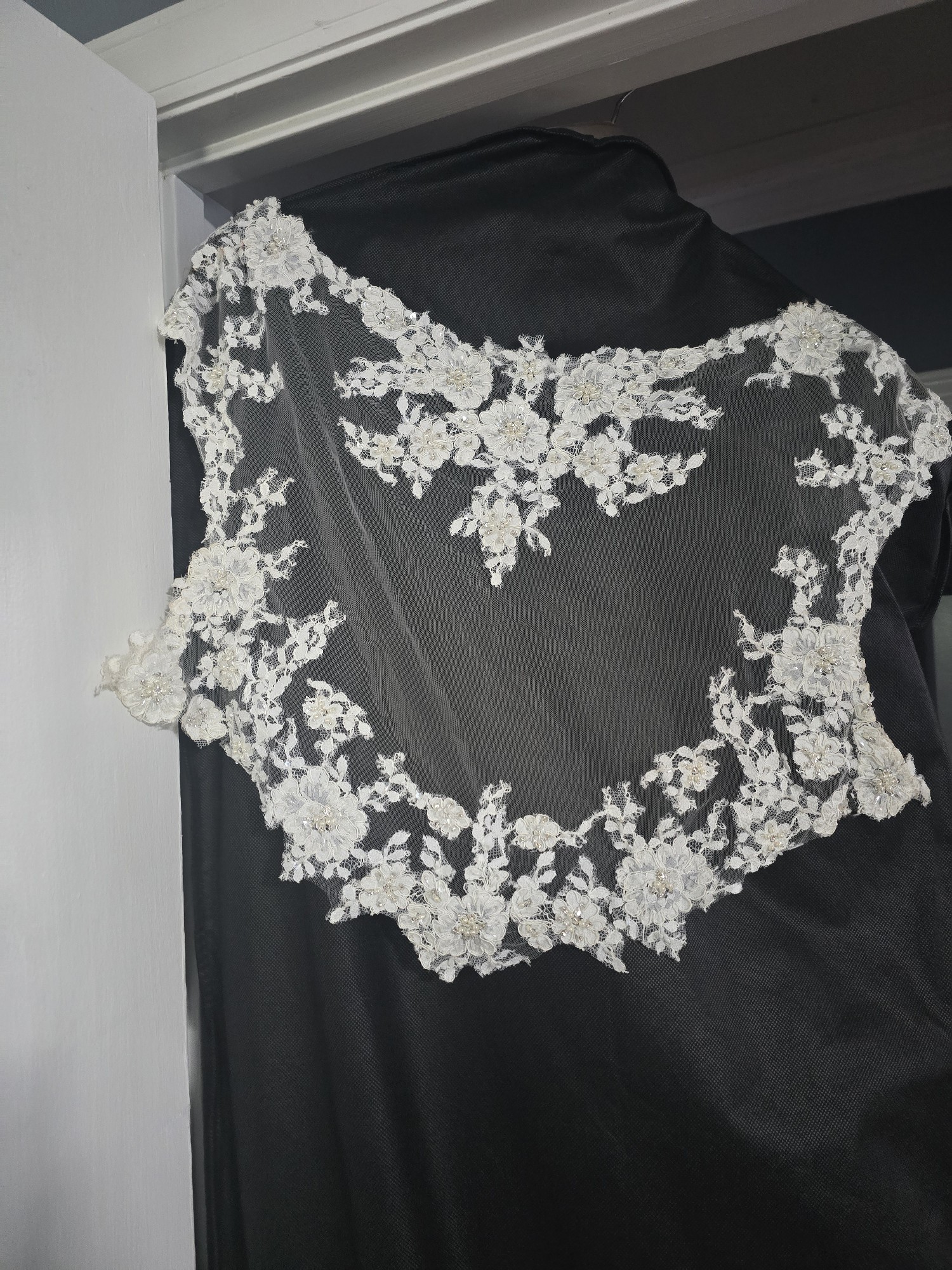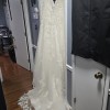 Ivory/with Silver Crystals and Pearls. Has a long Train, Detachable Lace Straps and Back