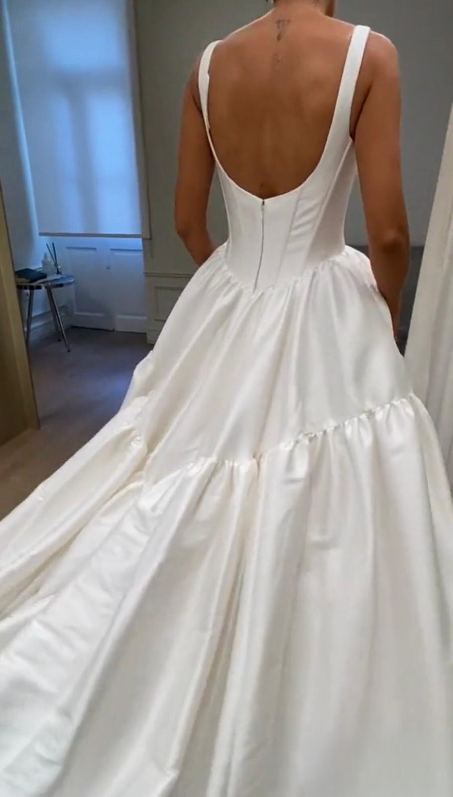 The gown is made of luxurious Mikado fabric, which gives it a beautiful structure and an elegant, subtle sheen. The princess cut with a low waist creates a regal silhouette, while the square neckline with wide straps highlights the décolleté in a modern, refined way. My absolute highlight was the nearly two-meter train – it creates a stunning entrance without feeling heavy to wear.