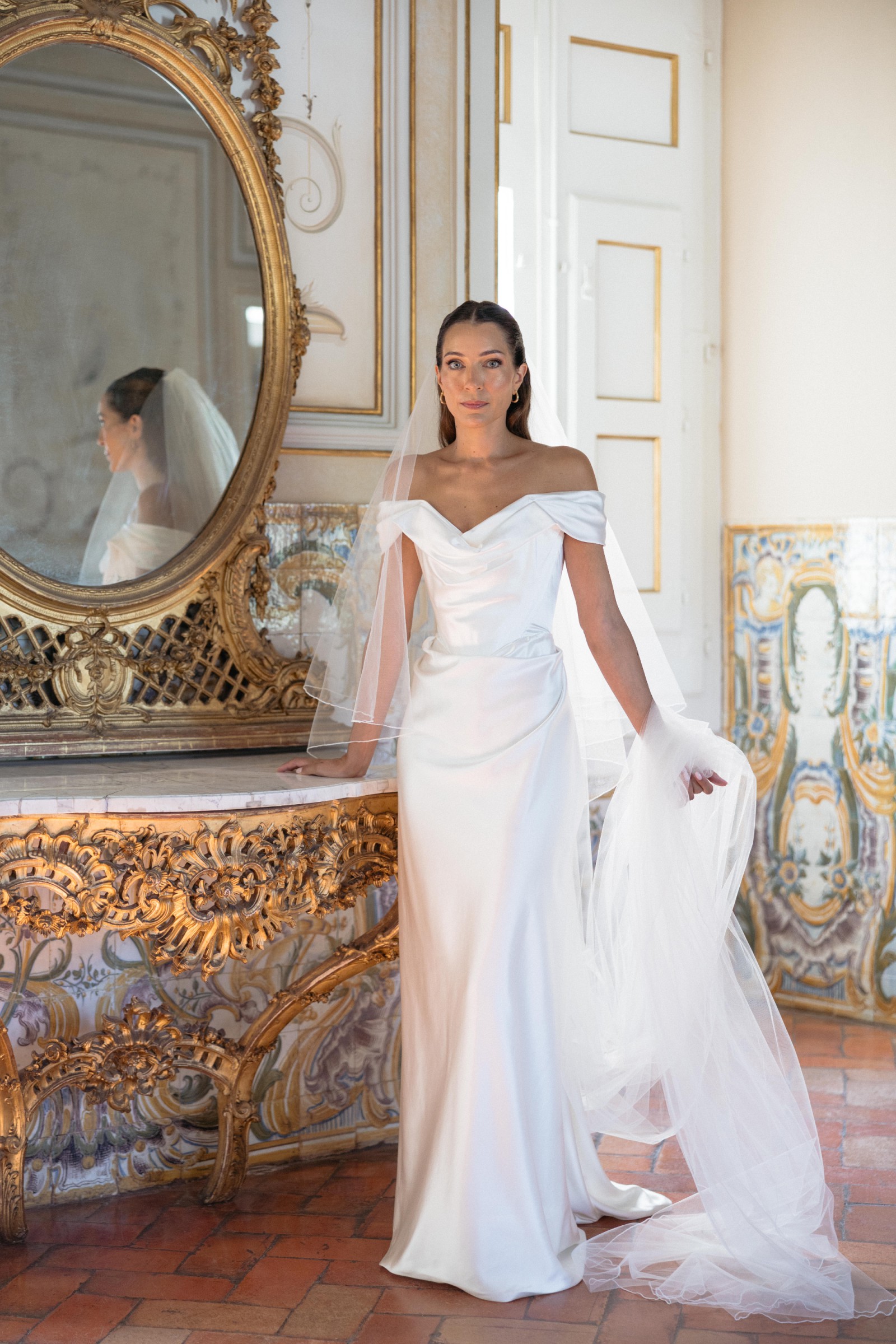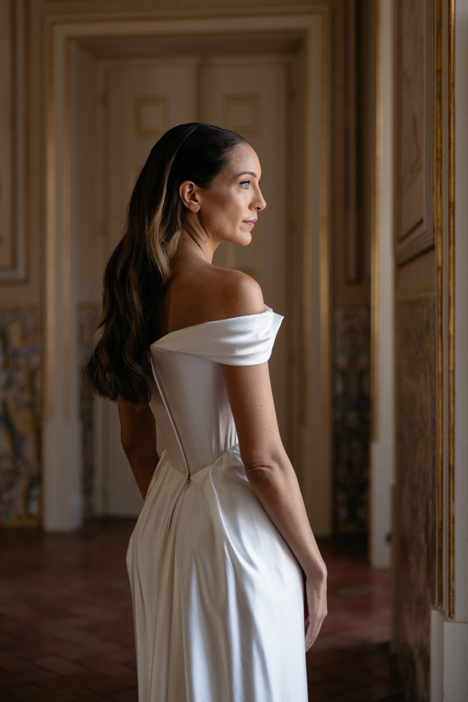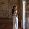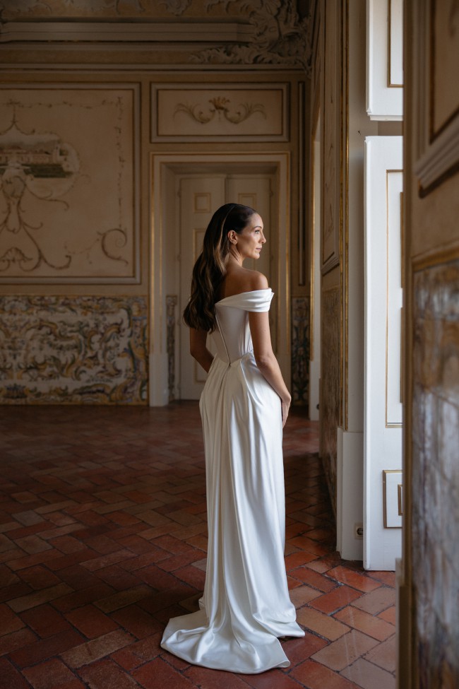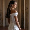 The off-the-shoulder neckline adds a touch of modern chic, enhancing the gracefulness of the gown while showcasing your collarbones and shoulders beautifully. Delicate straps provide support, ensuring you feel both secure and stunning as you celebrate your love story. With a mid-back design, this dress strikes the right balance between modesty and allure.