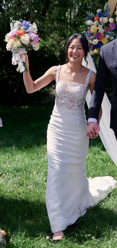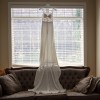 This dress is in excellent, almost brand-new condition and was worn only once on my wedding day. The dress is elegant yet comfortable, making it perfect for both the ceremony and the celebration afterward. Square neck dress with illusion bodice. Has delicate lace details and a simple train.