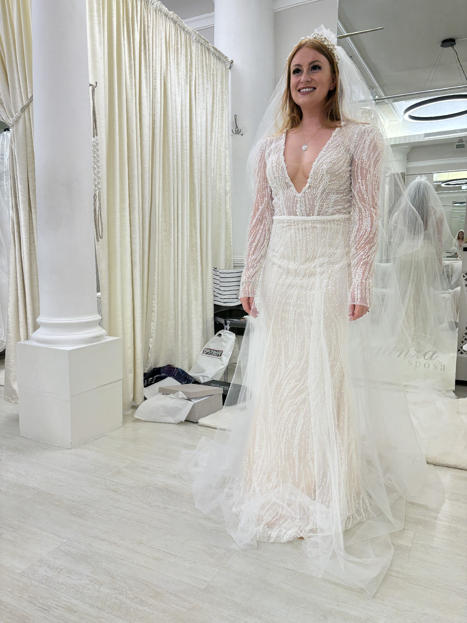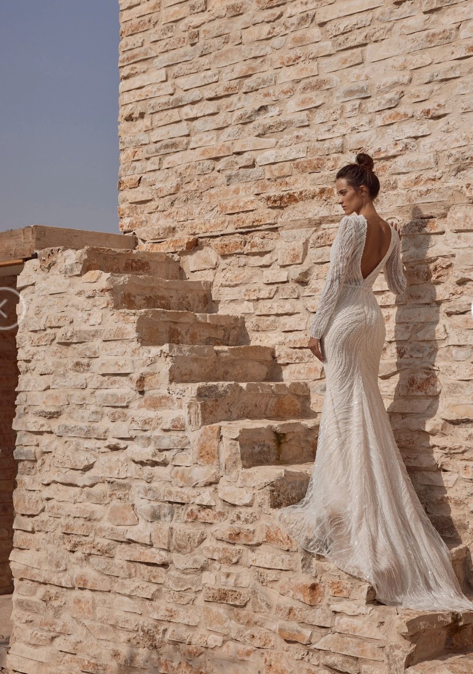 Saturn is a full length sleeved dress with a contemporary plunging neckline and an elaborate beading design, a combination that makes an absolute show stopper.