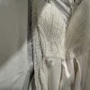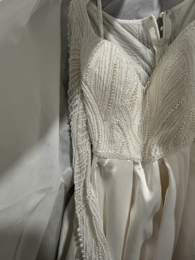 The long sleeves add an air of sophistication, thoughtfully detailed with delicate beading that glimmers with every movement. The intricate embellishments not only elevate the overall design but also enhance the timeless appeal of this gown. As you walk down the aisle, the soft fabric drapes elegantly, creating a classic silhouette that captures the essence of bridal romance.