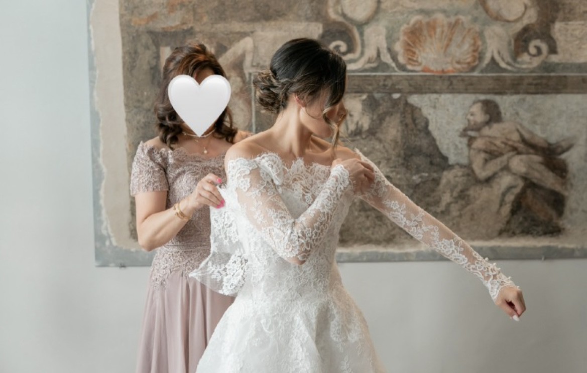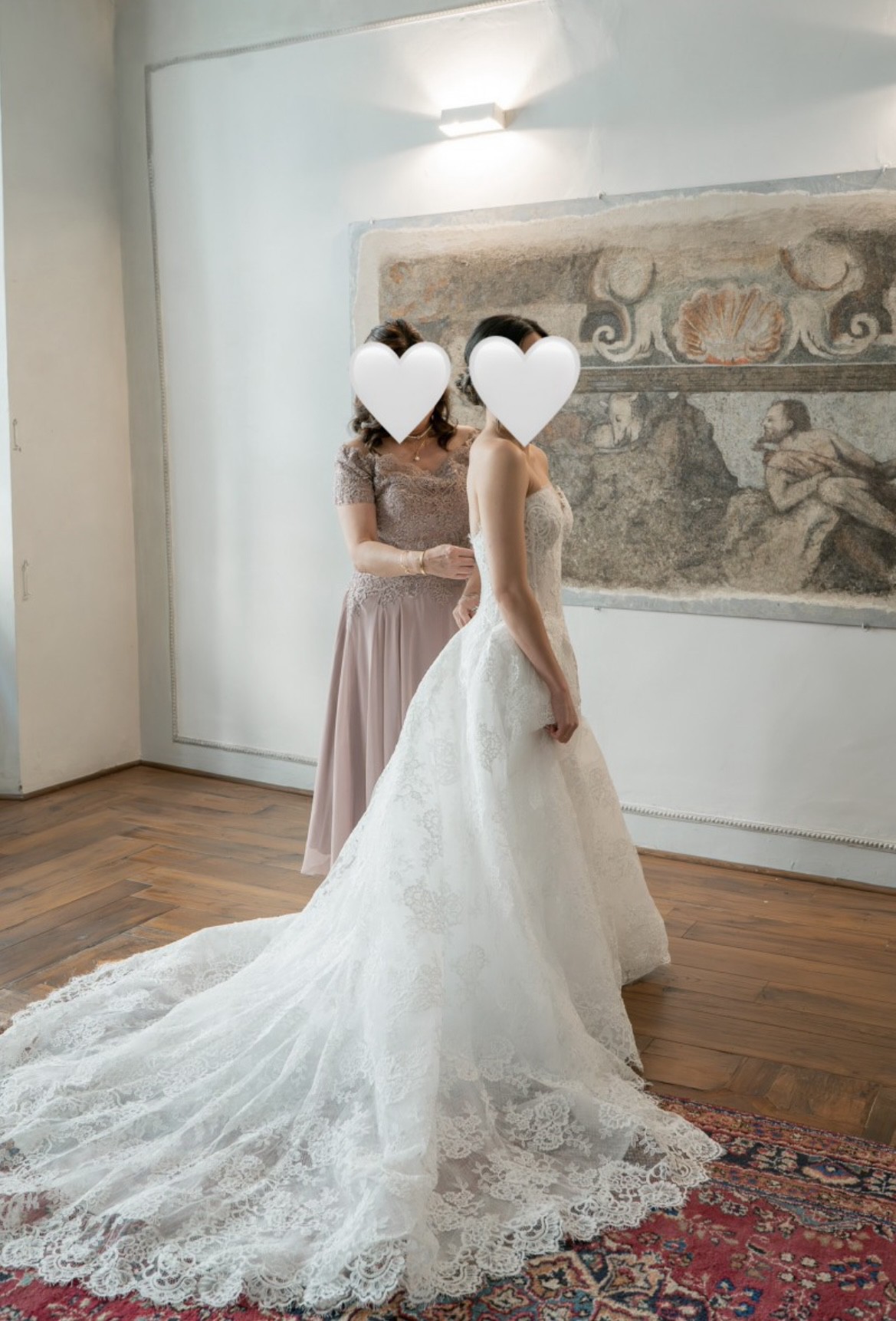 - The hem was adjusted for my height(5’3’m with 3” heels), a bustle was placed to secure the train for ease of mobility when needed, and chest cups were installed so I did not have to worry about wearing a separate bra