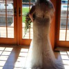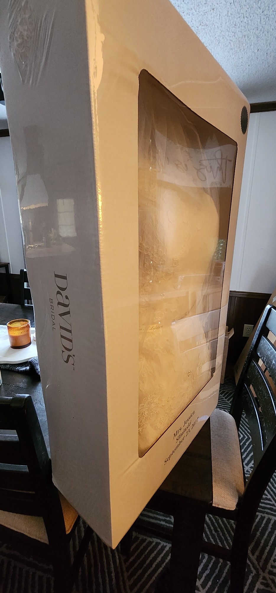 Ivory, size 14. Inner lining lightly hemmed. Has been preserved and I just opened it to confirm there are no stains or tears. Dress is in perfect condition. Vail with matching lace detail is included.