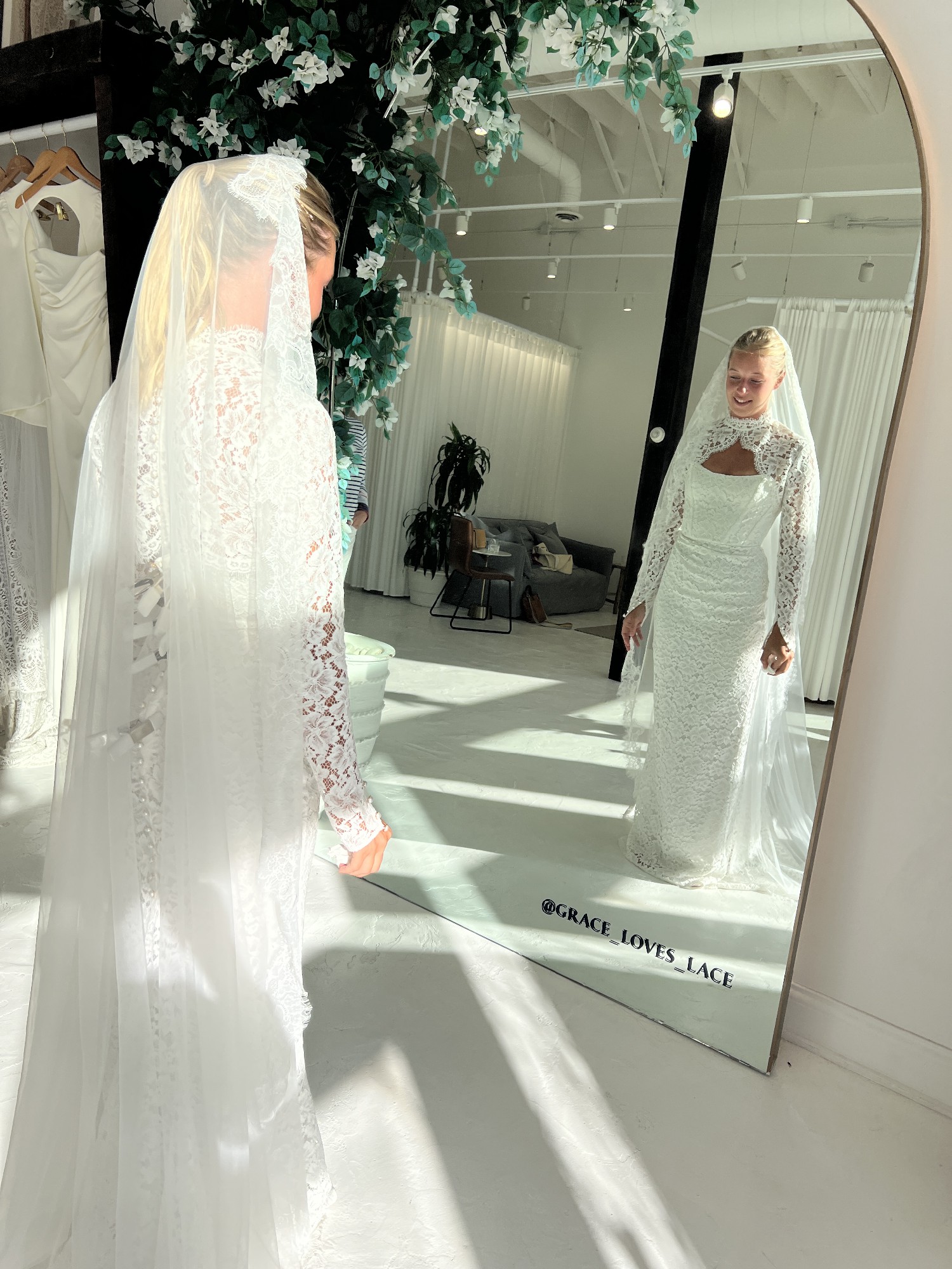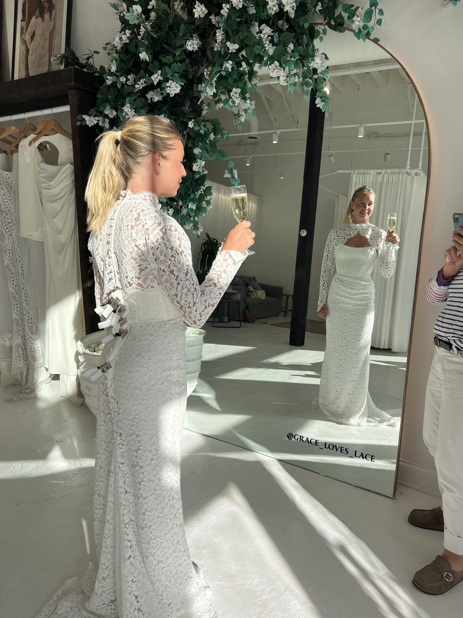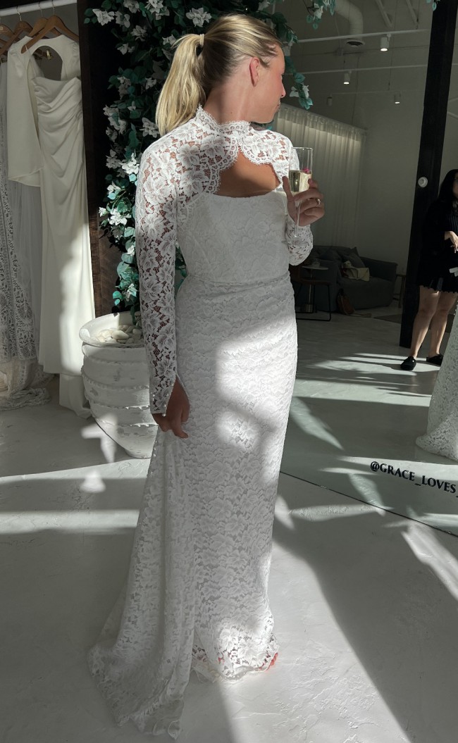 Never been worn before, size small, non-altered wedding dress from Grace Loves Lace. I purchased this dress in August and it is still being made and will be shipping in January of 2026. The dress also comes with a long sleeve and high neck over lay that is not attached to the dress. I also got a matching veil that can be gifted for free (you can see the veil in photos).