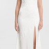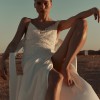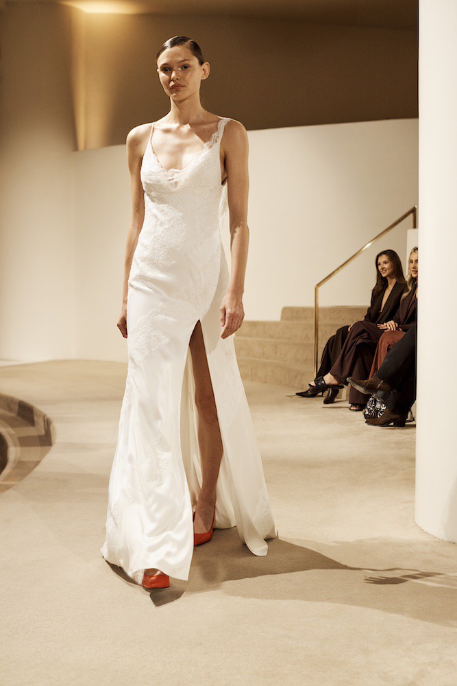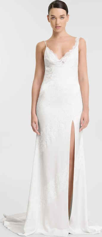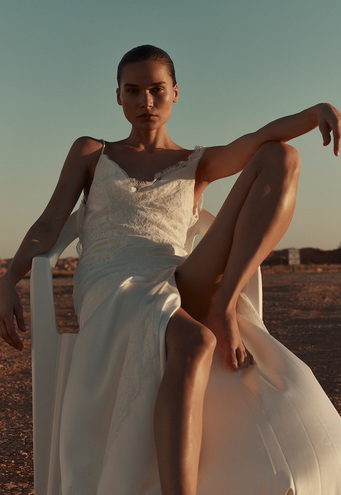Available with a side front split, Juniper delivers versatile, effortless impact, perfect for a ceremony-ready first look or a reception-ready second look. Designed for fashion-forward brides, this slip gown embodies the signature KYHA Bride aesthetic: luxurious, sculptural, and effortlessly modern.