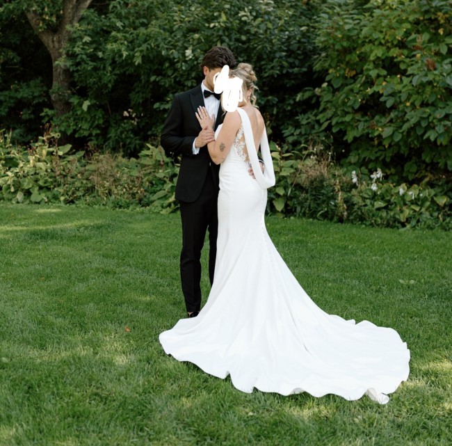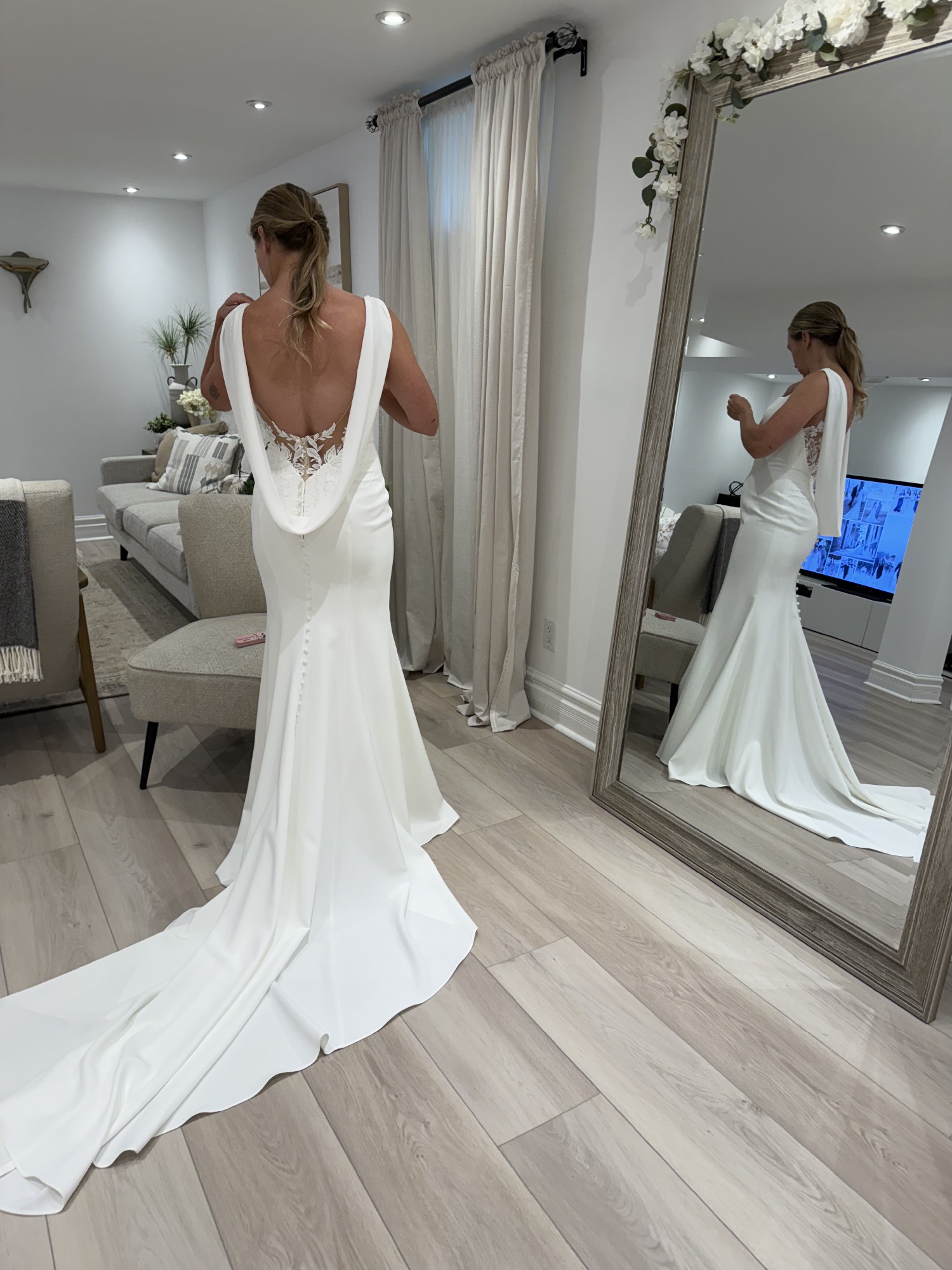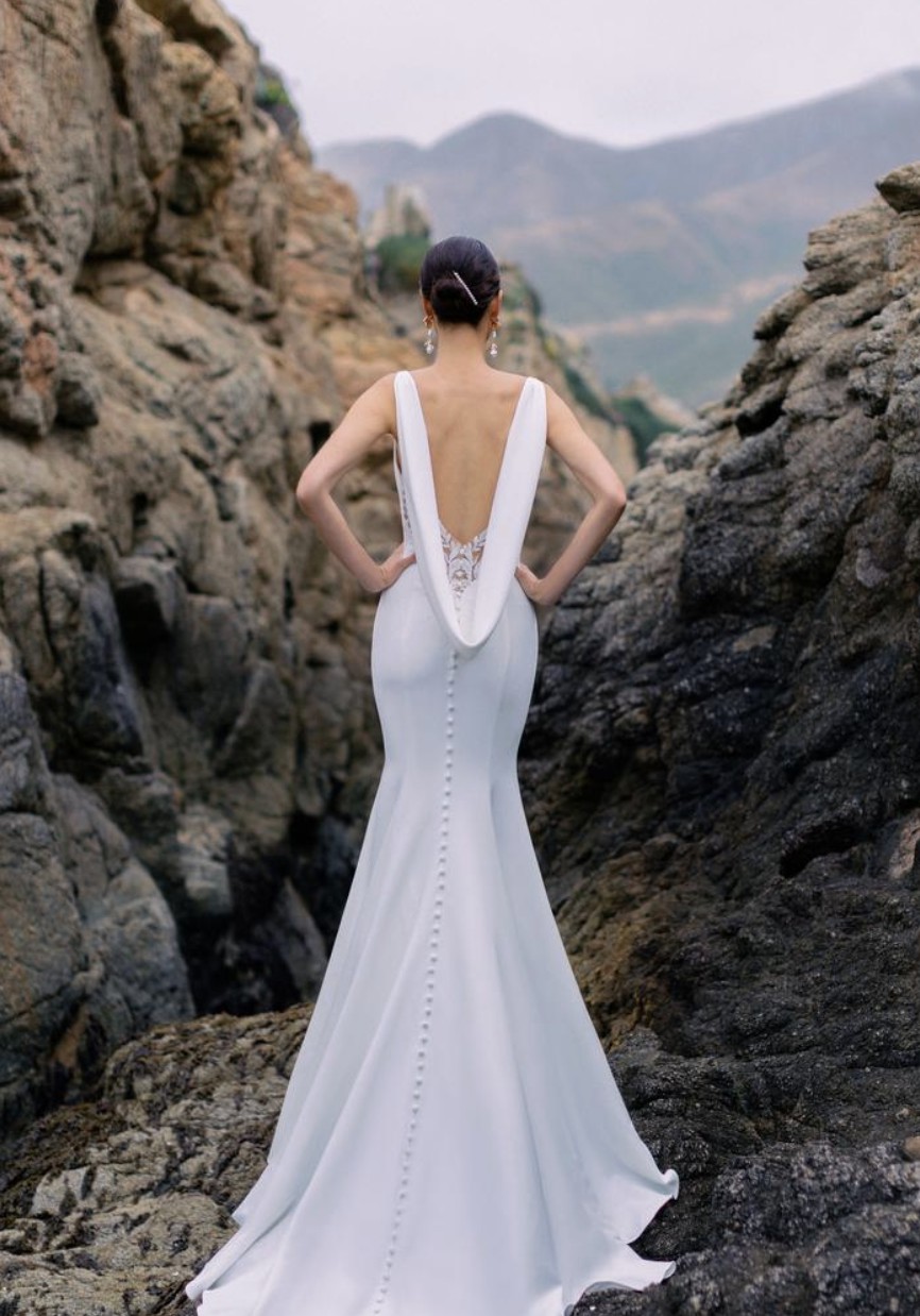 This Ava Gown by Alexandra Grecco is a dream come true for any bride looking to make a stunning statement on her special day. The moment I slipped into this fit-and-flare silhouette, I knew it was the one. The square neckline beautifully frames the décolletage, while the backless design adds an air of sensuality that’s both elegant and alluring.