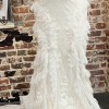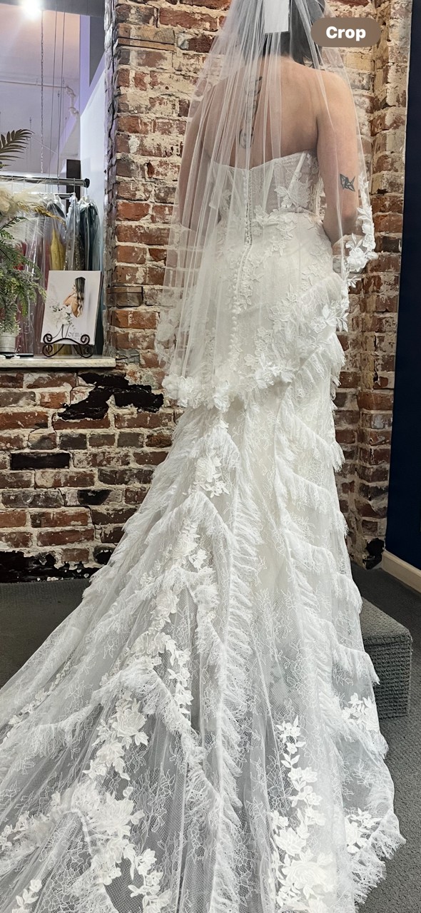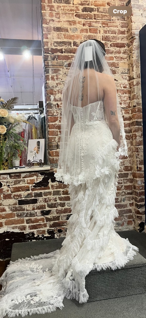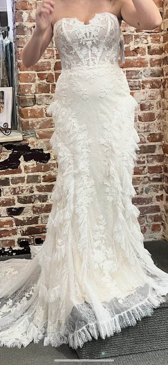 Crafted from exquisite lace, this ivory masterpiece exudes sophistication and charm, offering intricate detailing that will captivate your guests as you walk down the aisle. The strapless design provides a flawless fit, ensuring comfort and confidence throughout your special day. The low back adds a hint of allure, allowing for an enchanting view from every angle.