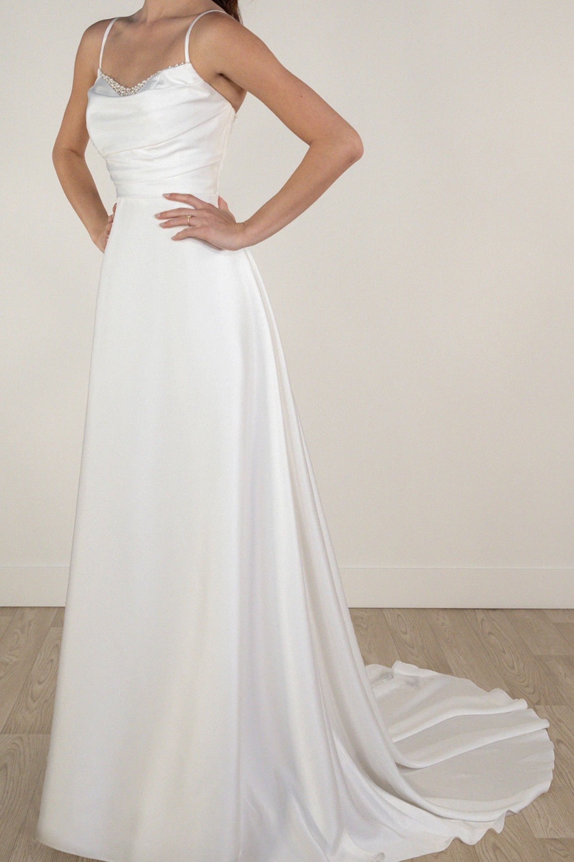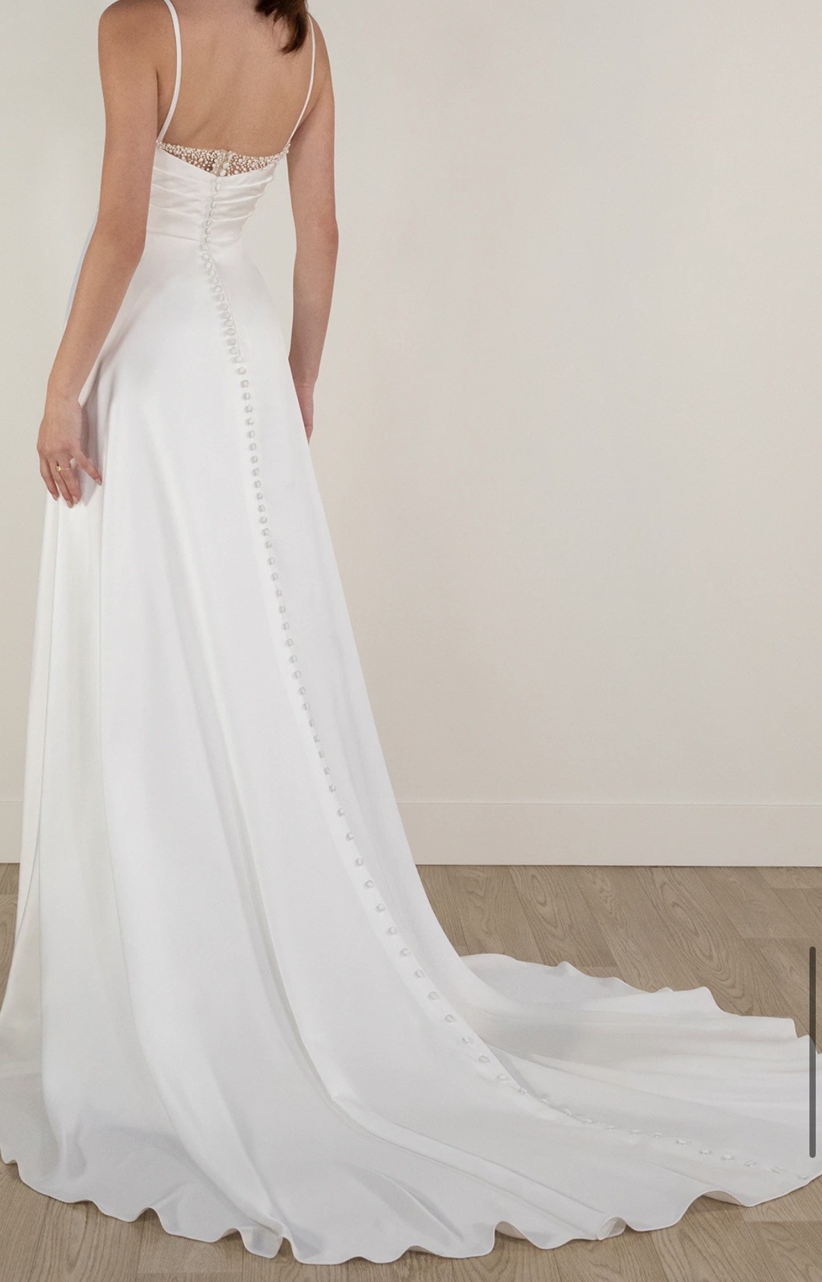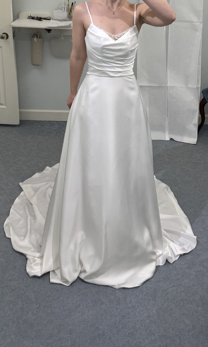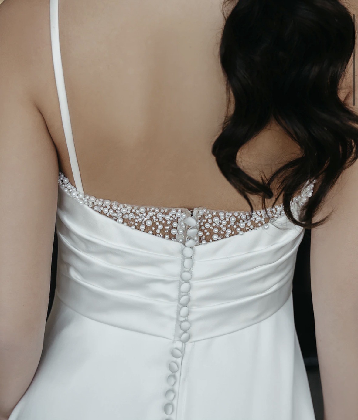 Description from website : Style 7915 radiates majestic splendor fit for the modern-day princess. This pearl-embellished wedding dress features an A-line silhouette in a lustrous, high shine satin. Delicate spaghetti straps complement a softly draped scoop neckline accented by graceful pearl strands for a subtle yet opulent touch. The royal and refined aesthetic hugs the torso in an impeccably tailored fit, complemented by a pearl back detail and full-length row of fabric-covered buttons down the back. Timeless and elegant, this princess wedding gown promises an unforgettable wedding day look.