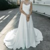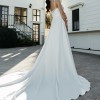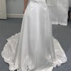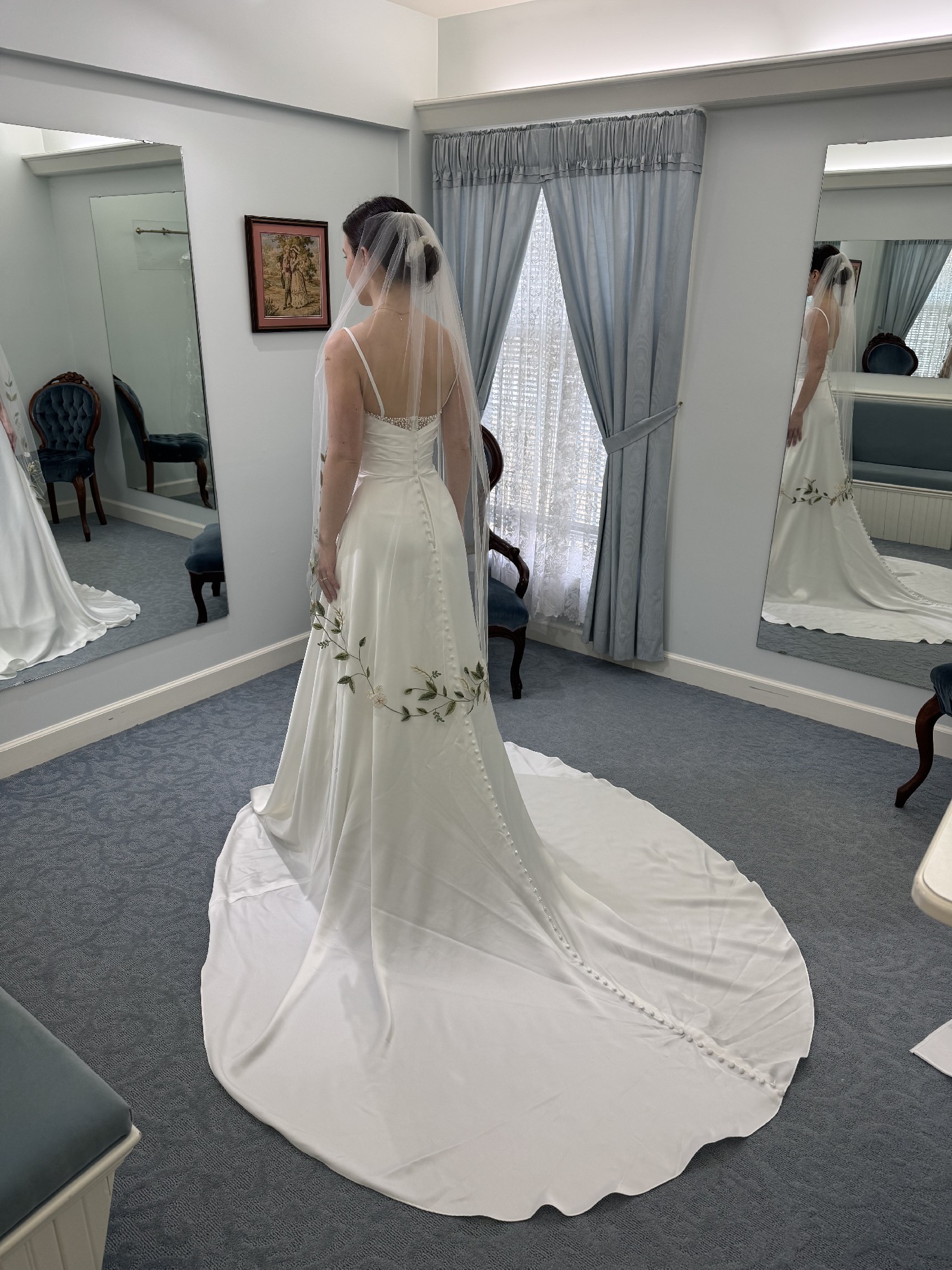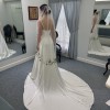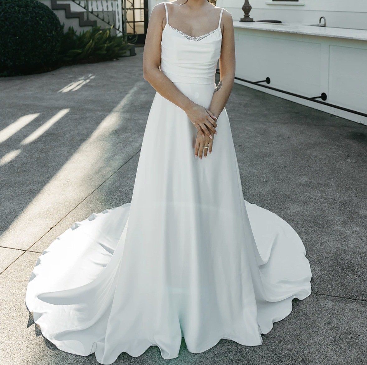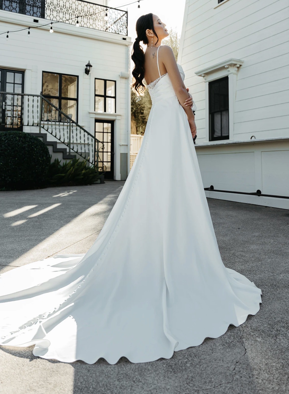 Description from website : Style 7915 radiates majestic splendor fit for the modern-day princess. This pearl-embellished wedding dress features an A-line silhouette in a lustrous, high shine satin. Delicate spaghetti straps complement a softly draped scoop neckline accented by graceful pearl strands for a subtle yet opulent touch. The royal and refined aesthetic hugs the torso in an impeccably tailored fit, complemented by a pearl back detail and full-length row of fabric-covered buttons down the back. Timeless and elegant, this princess wedding gown promises an unforgettable wedding day look.