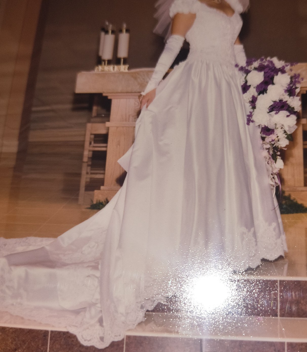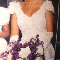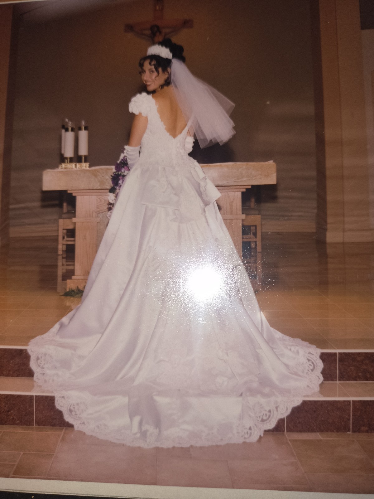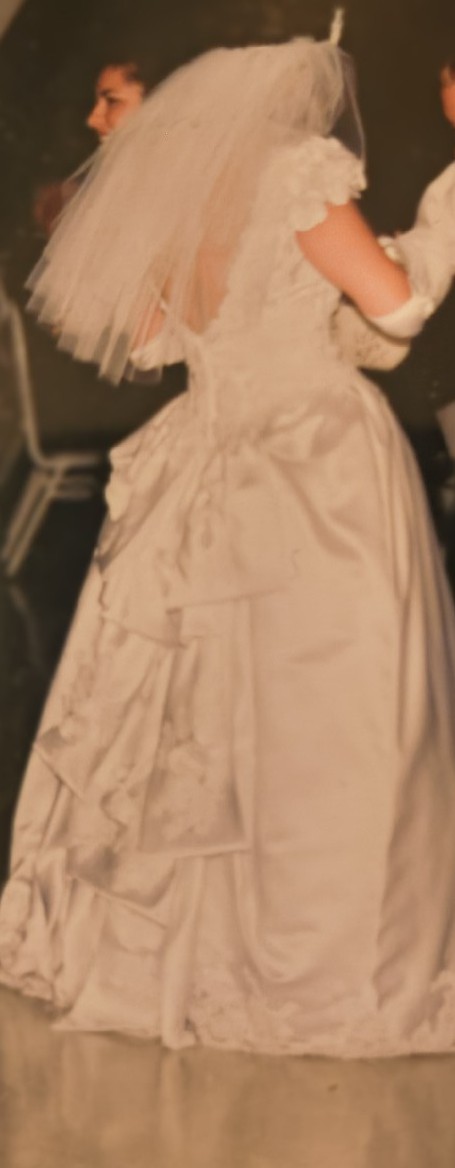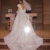 - Hidden loops and buttons were added to bustle the train accentuating the beautiful back of the dress
