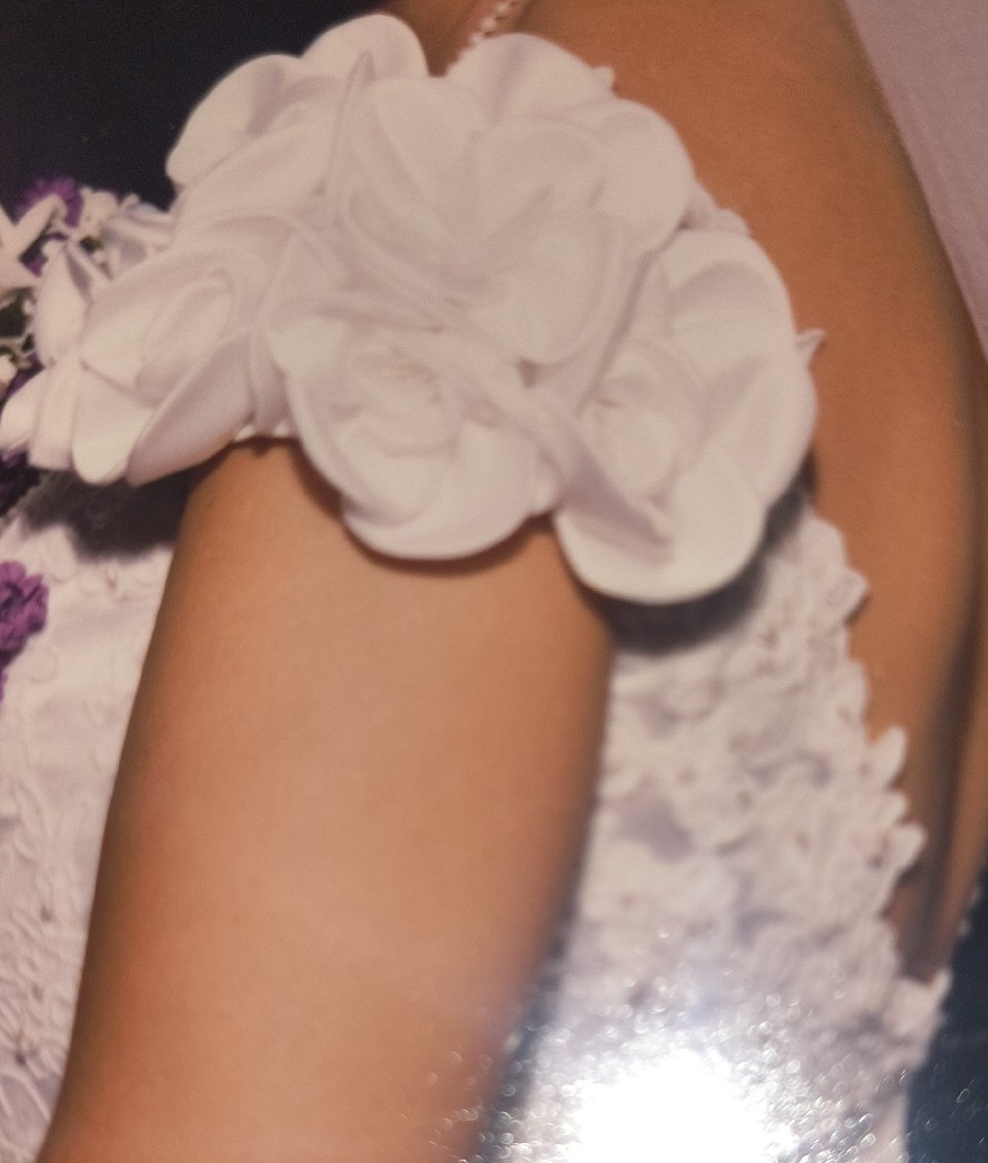 This exquisite dress was on the cover of Bridal magazine in 1998.. Beautiful princess type dress. It is a fitted bodice that becomes a full skirt. Rose details are seen throughout dress, and accentuate the cap sleeves. This dress was professionally cleaned and packed so that it would retain it's original color and style.